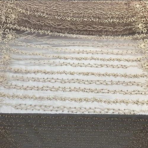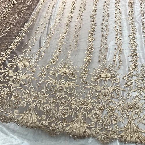 Blush design beaded fabric lace is very bright in colour and by textures. This lace is a very attractive and unique style design linked with current fashion trends. Decorated by small blush stones pearls that give tremendous look. Because we’re always caring about the grade of the product for the latest fashion trends. A blush beaded design with bone thread. The mixture of hand and machine embroidered, modern and traditional also. These corded flowers are embroidered with sequins on a mesh lace fabric giving off a sophisticated and elegant look. The lace has double scallops on the width. This lace can be used for dresses, tablecloths, nightgowns, prom gowns, bridal gowns, wedding gowns, and runners.