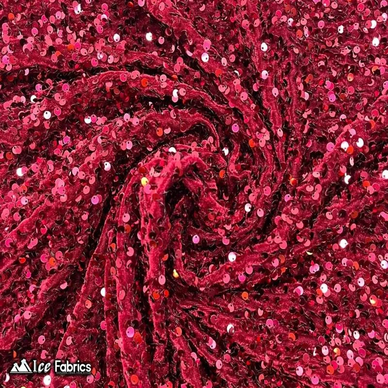 IceFabrics offers “Burgundy Emma Design Sequin Embroidered 2 Way Stretch Velvet Fabric by the Yard” in variant colors and unique size.