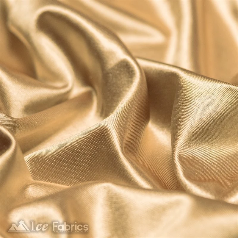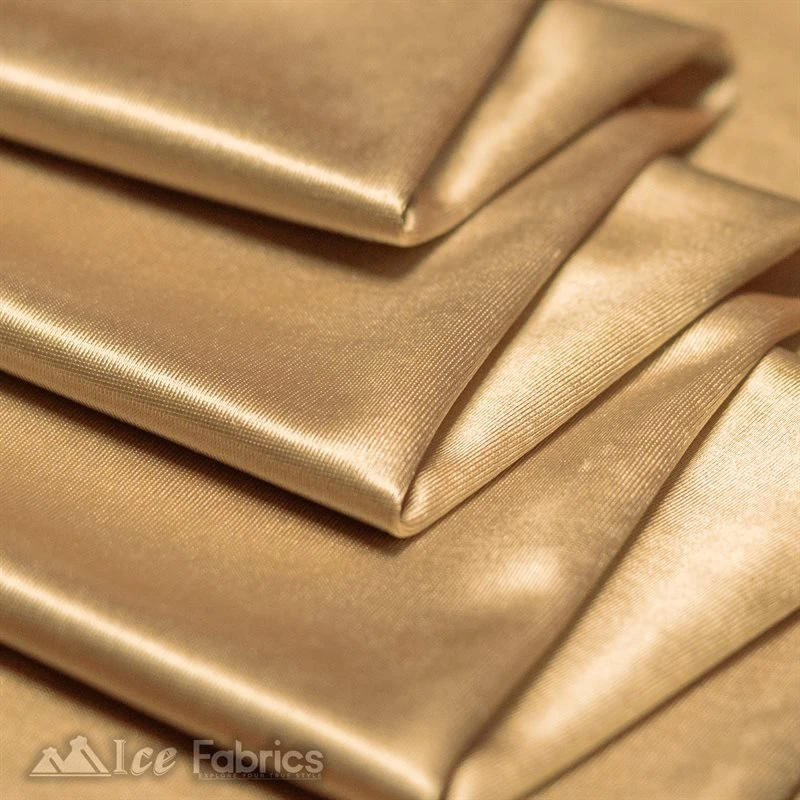 IceFabrics offers Casino Shiny Champagne Spandex 4 Way Stretch Satin Fabric in variant colors and unique size.