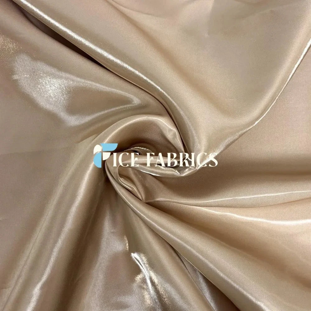 Indulge in the timeless elegance of Champagne Reflective Liquid Crystal Silky Satin Fabric, a luxurious textile designed to elevate any creation. This silky satin fabric boasts an exquisite sheen, a soft, smooth texture, and a unique reflective quality that catches the light beautifully.