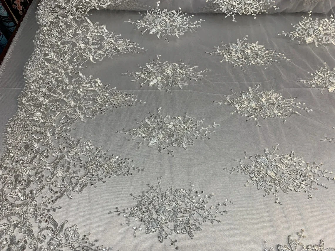 Get ready with our Corded White Embroidered beaded Lace Fabric and look stylish wherever you go. This fabric is shiny and bold, which will make you confident in yourself. Confidence attracts people to you, and with the added shine of the fabric, you will be the party’s life.