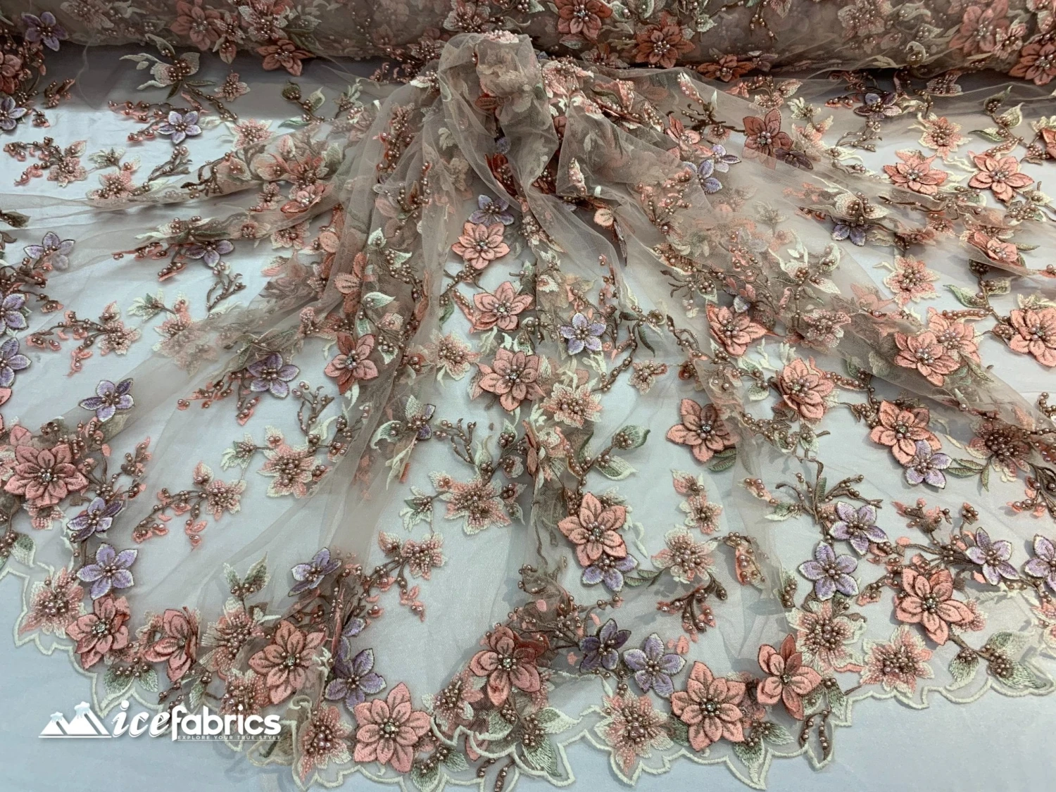 Luxury Beaded Fabric By The Yard_ 3D Flowers Lace Fabric On a Mesh (Red) Embroidered Floral Fabric/ Bridal Fabric