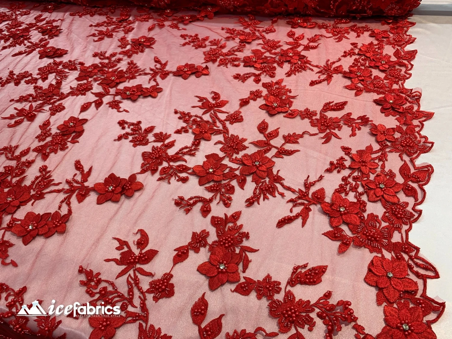 Luxury Beaded Fabric By The Yard_ 3D Flowers Lace Fabric On a Mesh (Red) Embroidered Floral Fabric/ Bridal Fabric