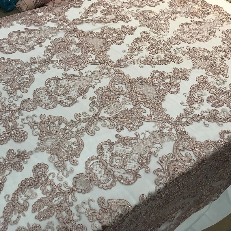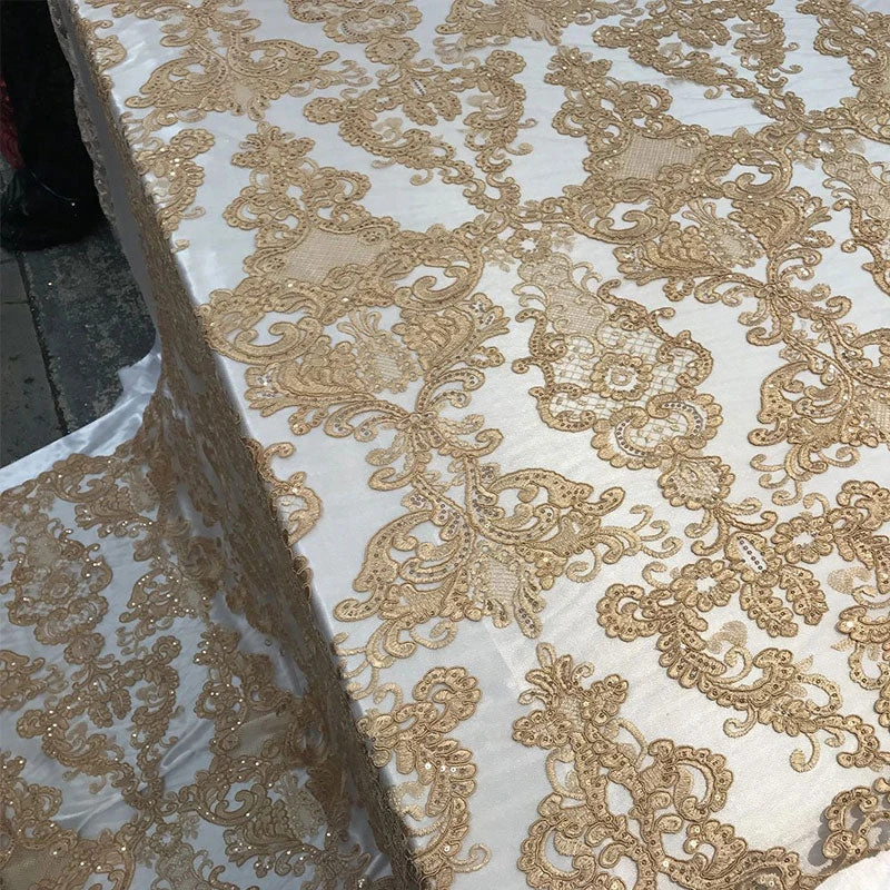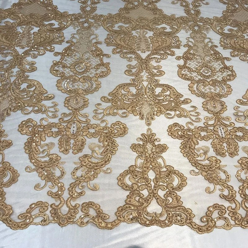 Design mesh lace sequins by the yard wedding prom dress are fine-looking and stylish. It has embroidered with colored threads that make the lace delightful and gleaming. It gives you an extraordinary shine and graceful look. This lace makes your event unique and provides a prominent look to the wearer, wearing a mesh lace suit makes your personality gorgeous and makes you feel happy.