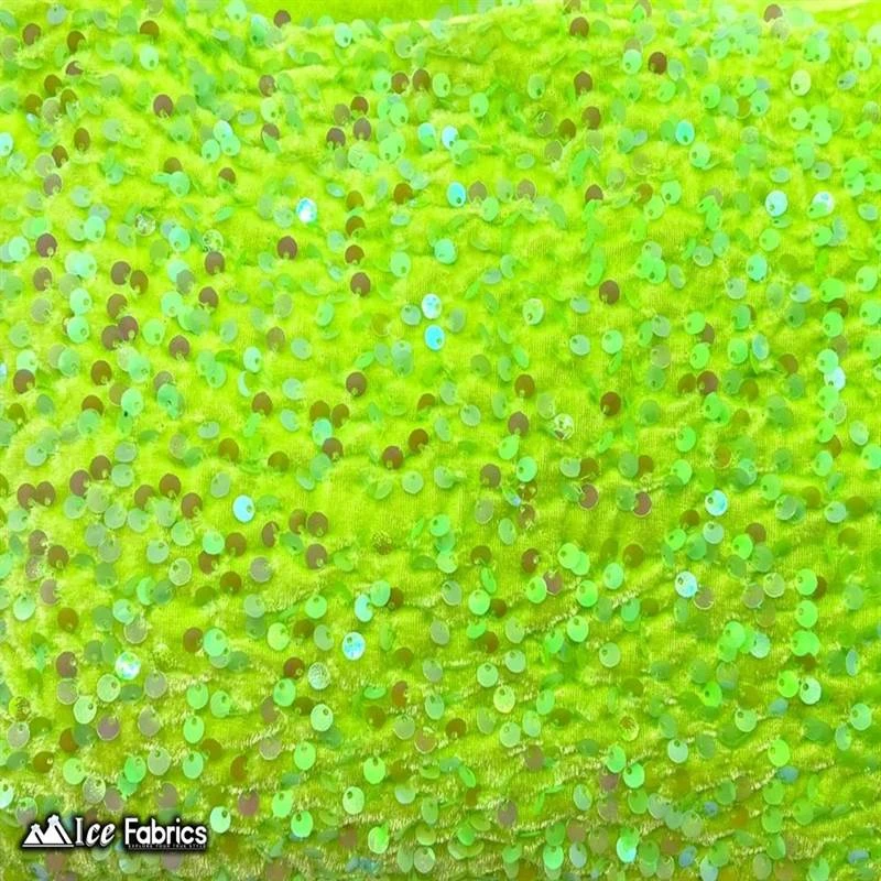 IceFabrics offers “Neon Lime Green Emma Embroidered Sequin Velvet Fabric “ in variant colors and unique size.