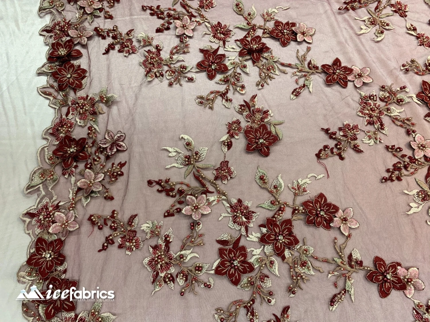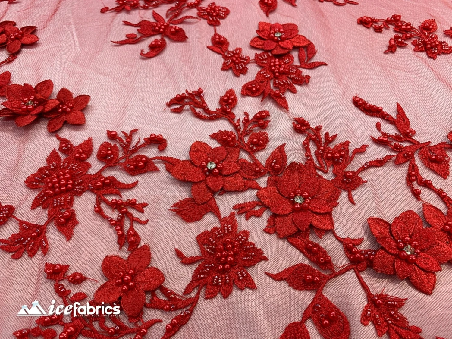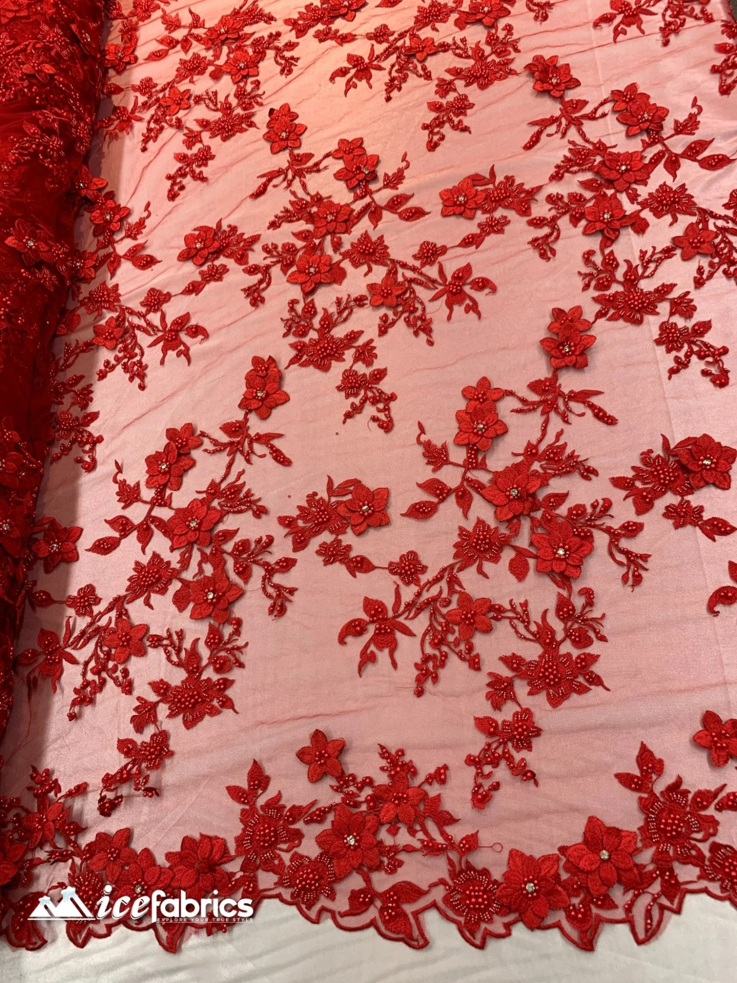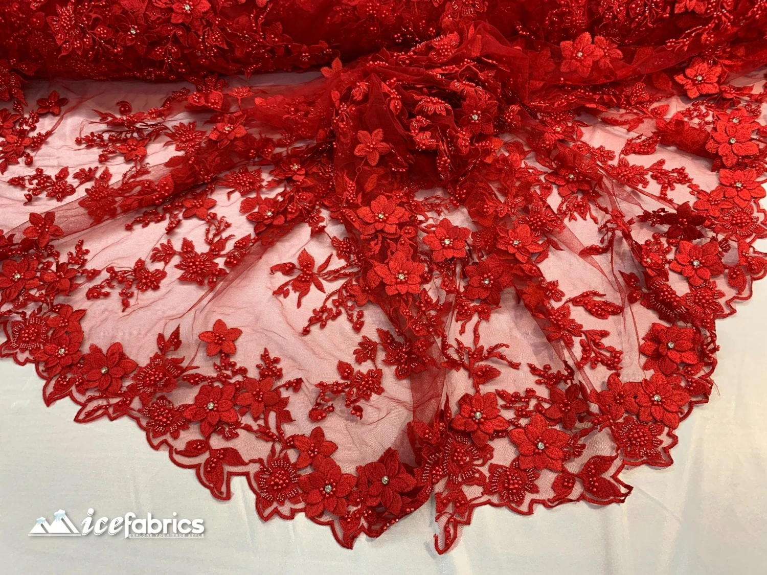 Luxury Beaded Fabric By The Yard_ 3D Flowers Lace Fabric On a Mesh (Red) Embroidered Floral Fabric/ Bridal Fabric
