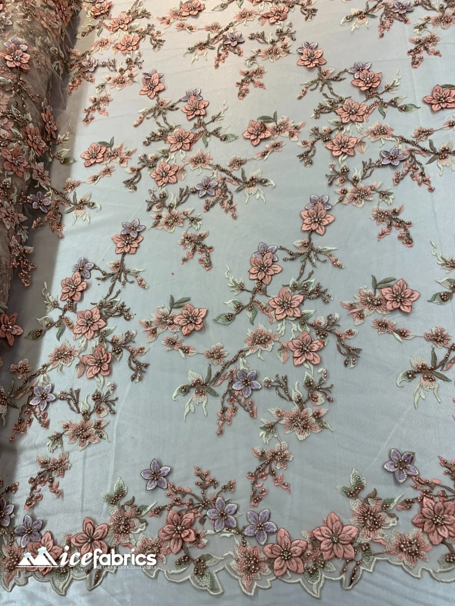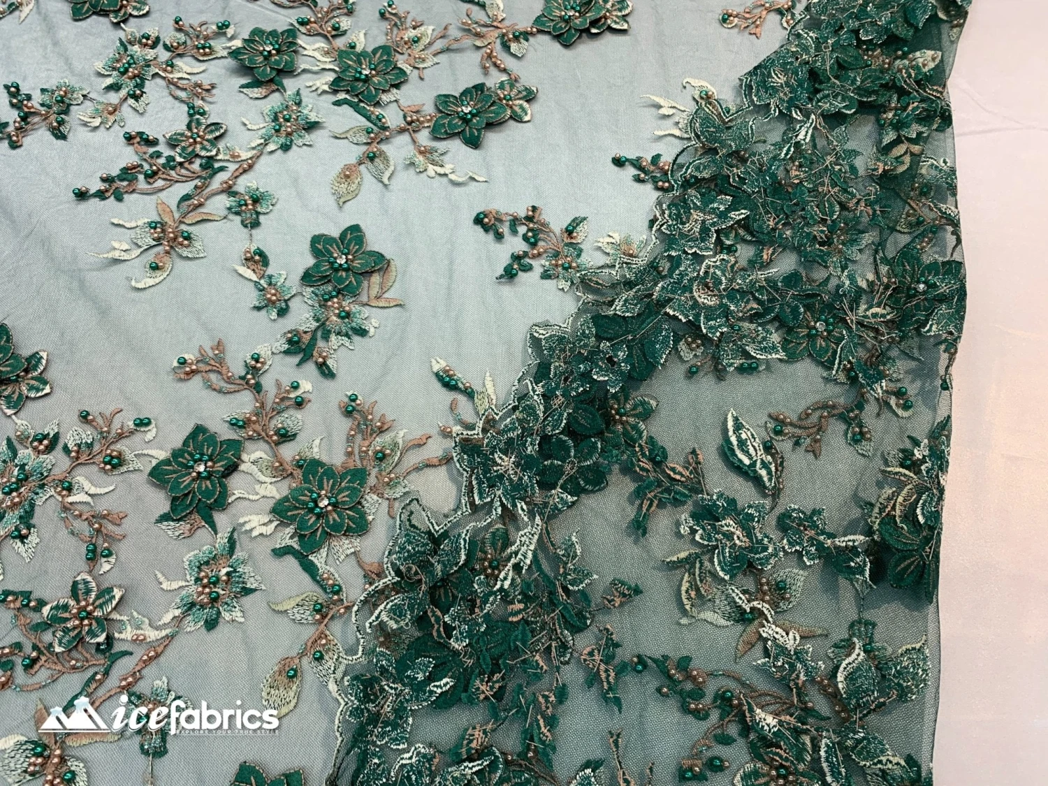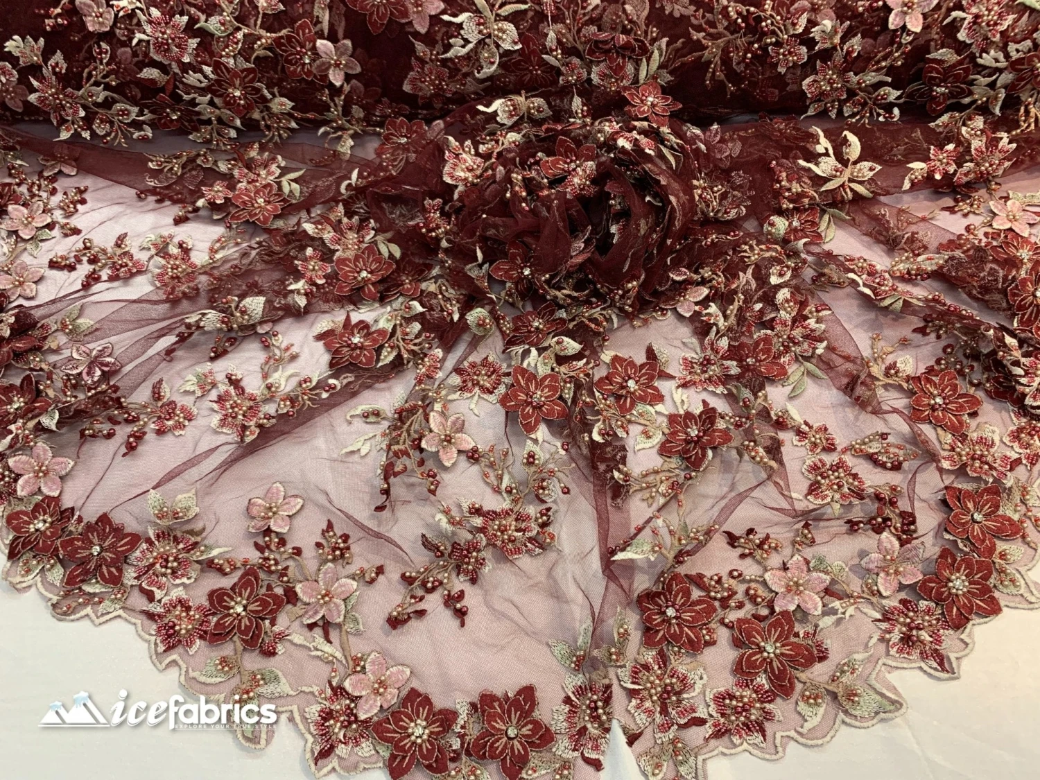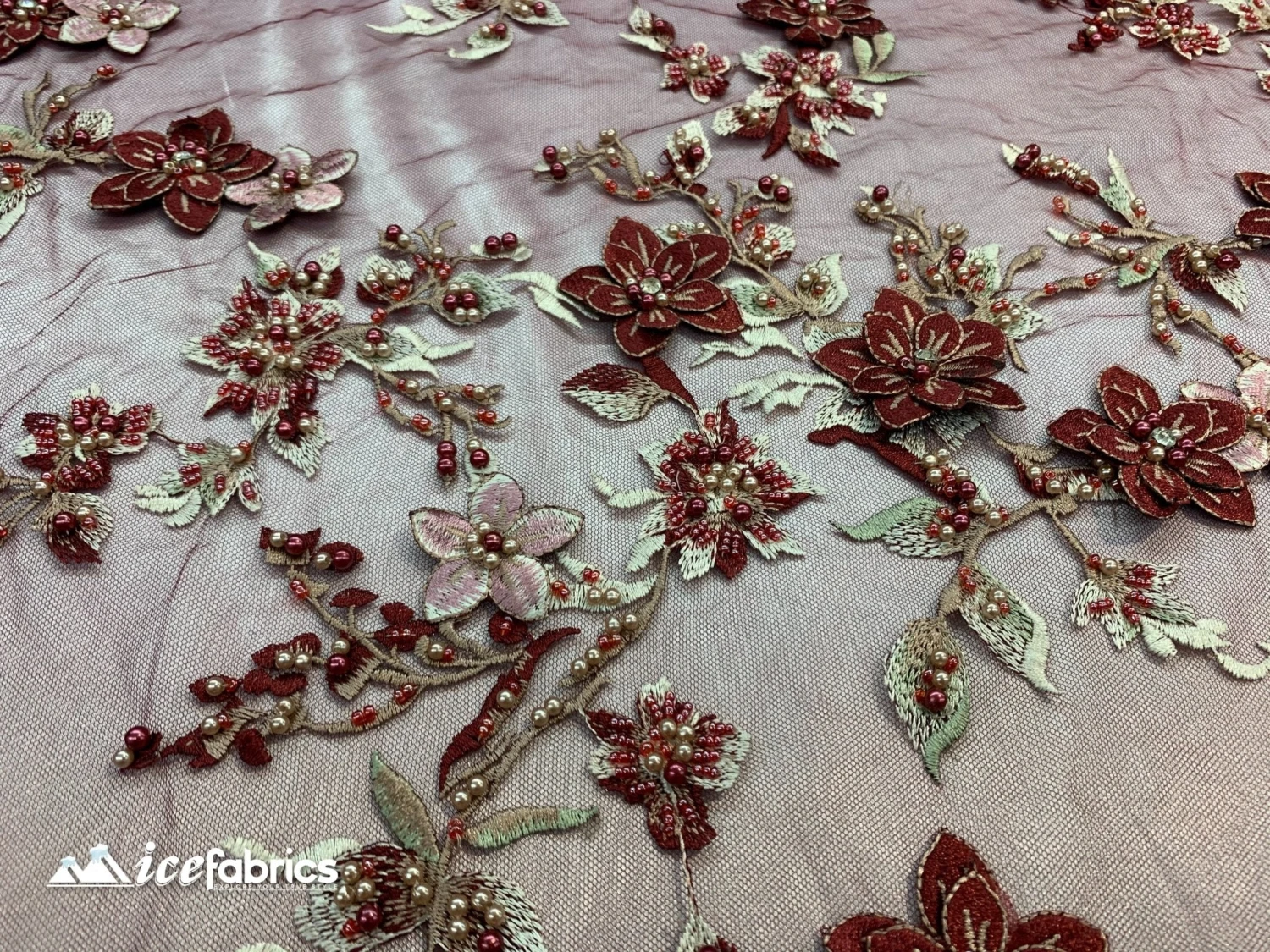 Luxury Beaded Fabric By The Yard_ 3D Flowers Lace Fabric On a Mesh (Red) Embroidered Floral Fabric/ Bridal Fabric
