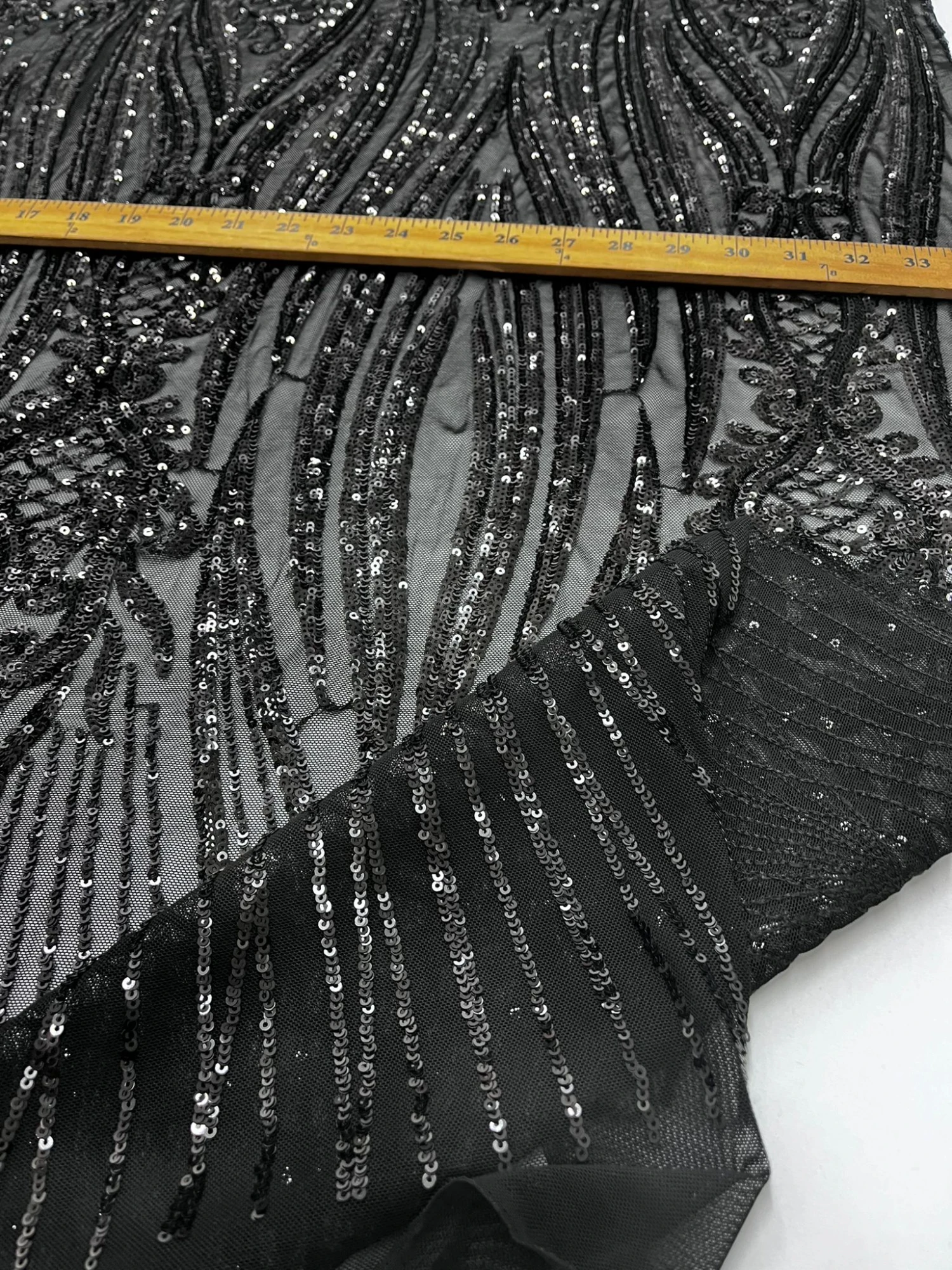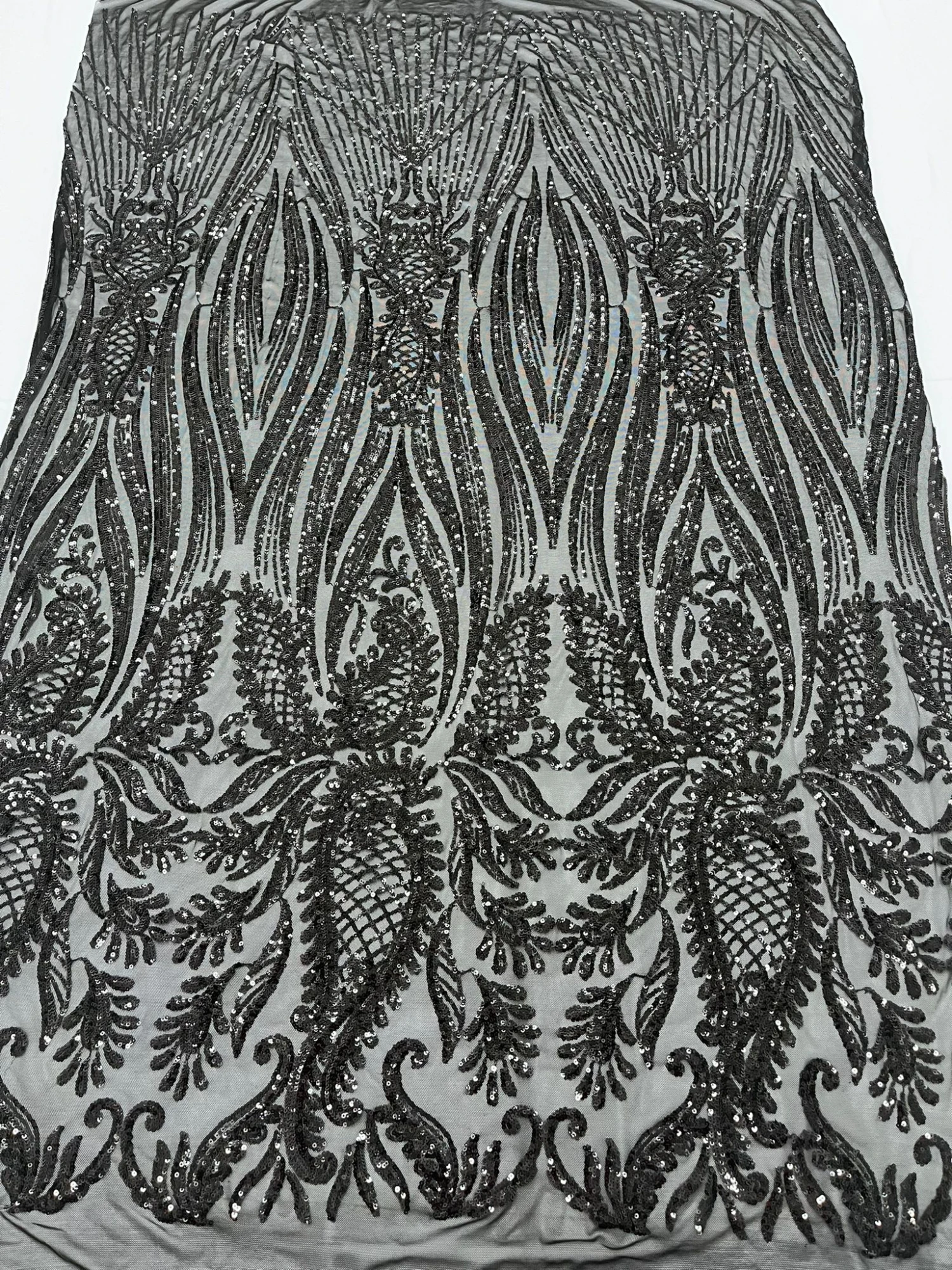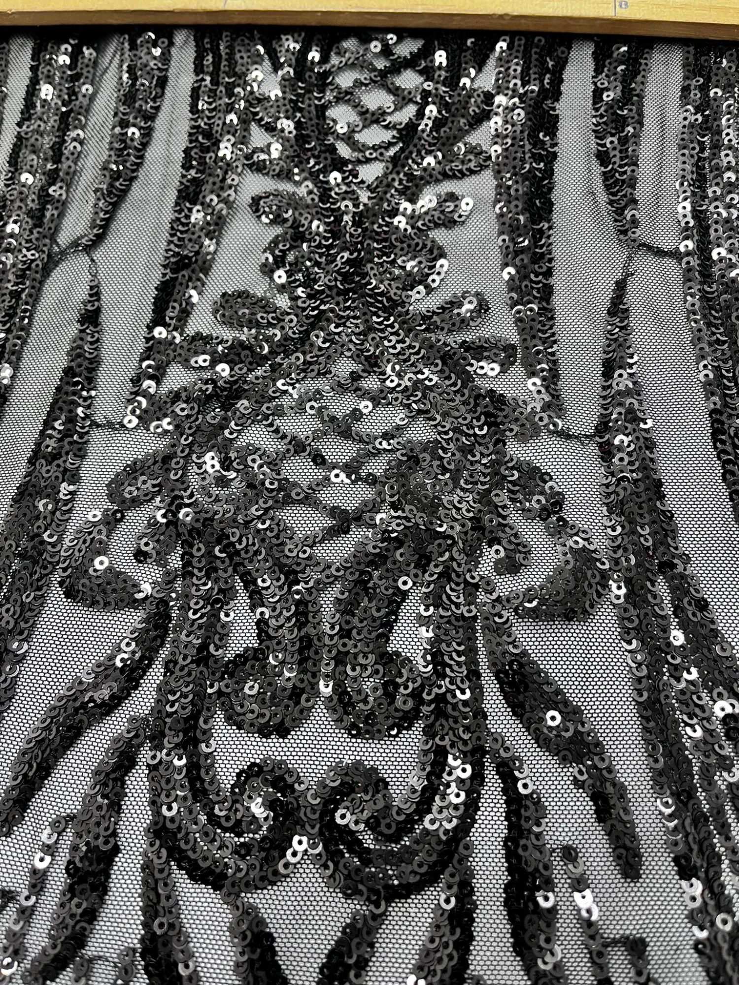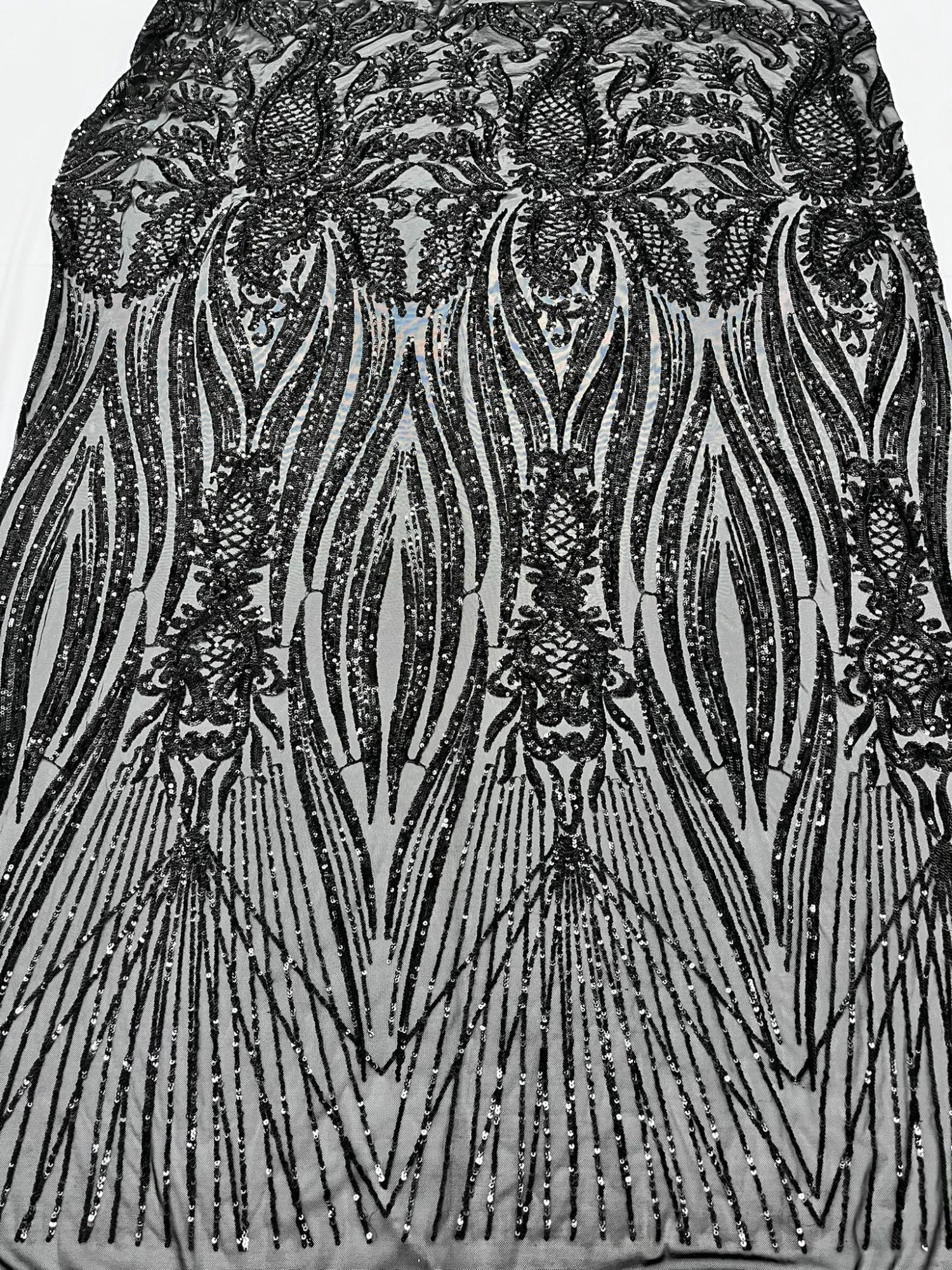 ICE Fabrics offers “4 Way Geometric Embroidery Black Sequins Stretch Fabric” in unique sizes and variant colors.