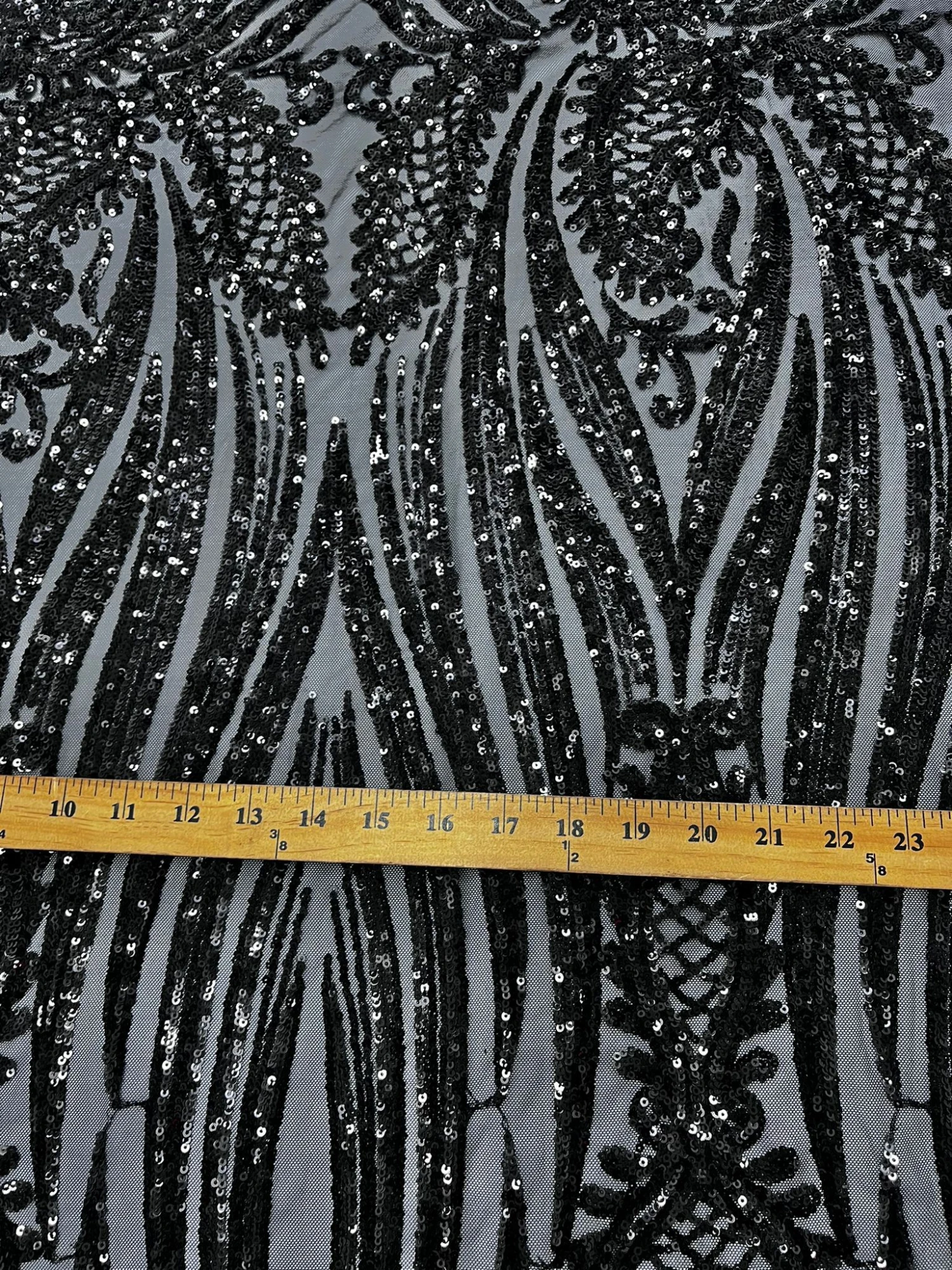 Black Geometric 4 Way Stretch Sequin Embroidered Fabric