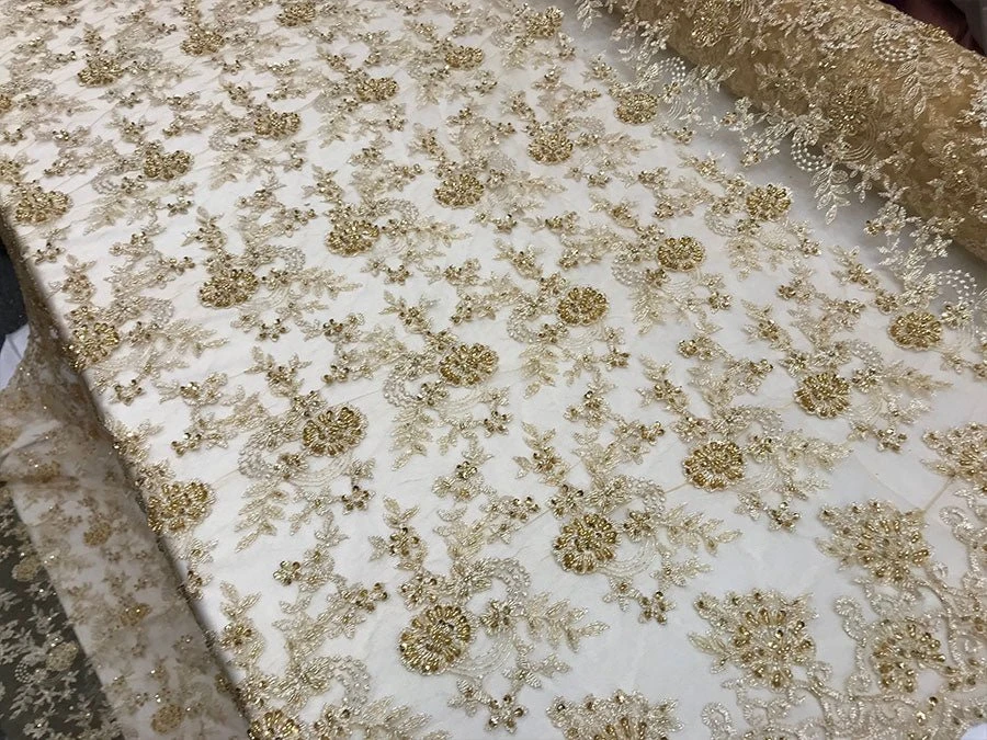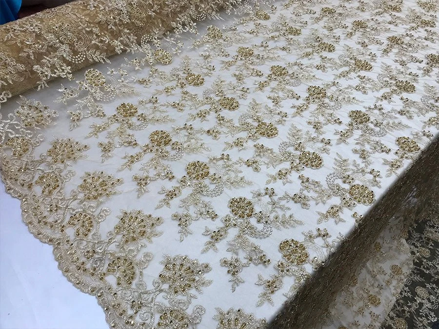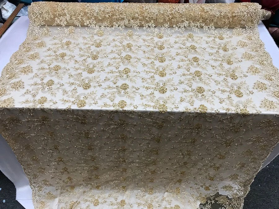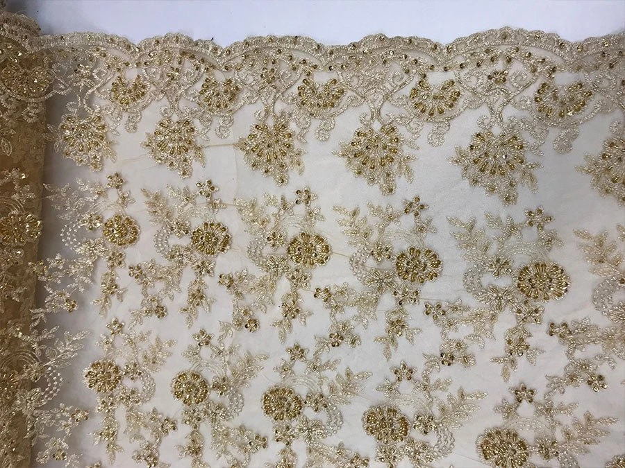 Gold Design Bridal Wedding Beaded Mesh Lace Fabric