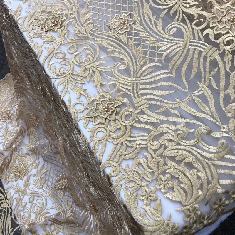 Bridal Wedding Designed Gold Beaded Mesh Lace Fabric