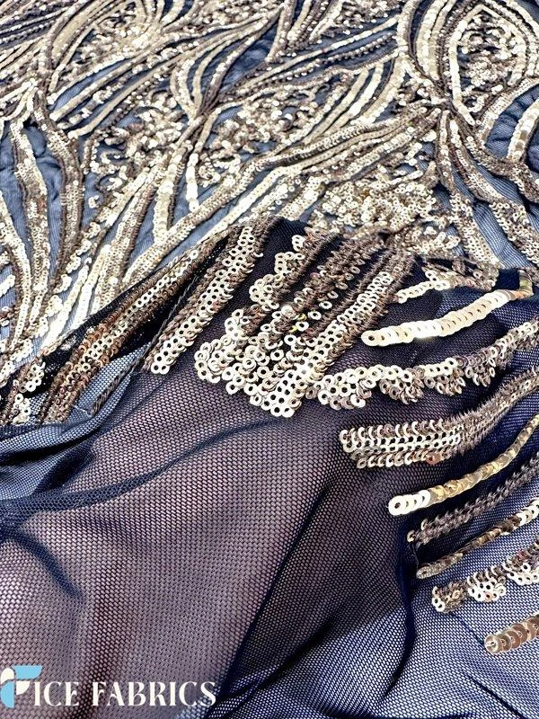 The Gold on Black Damask Stretch Sequin Fabric is designed to elevate your creativity. Made with a durable mesh base and featuring sequins in a beautiful damask pattern, it is both stylish and strong. The 4-way stretch allows it to stretch in all directions, ensuring a perfect fit for clothing and easy handling for creative projects. This stretch sequin fabric is perfect for costumes, special occasions, and luxurious home décor.