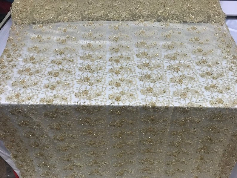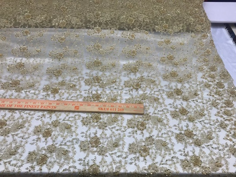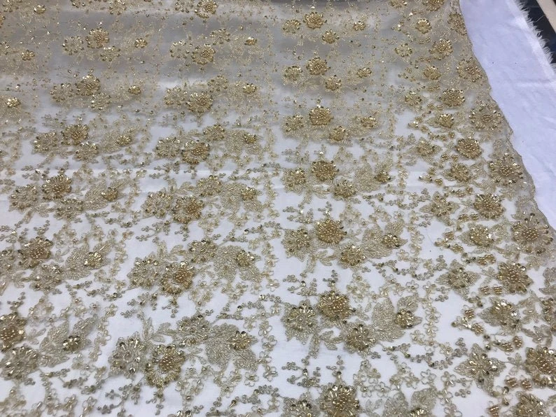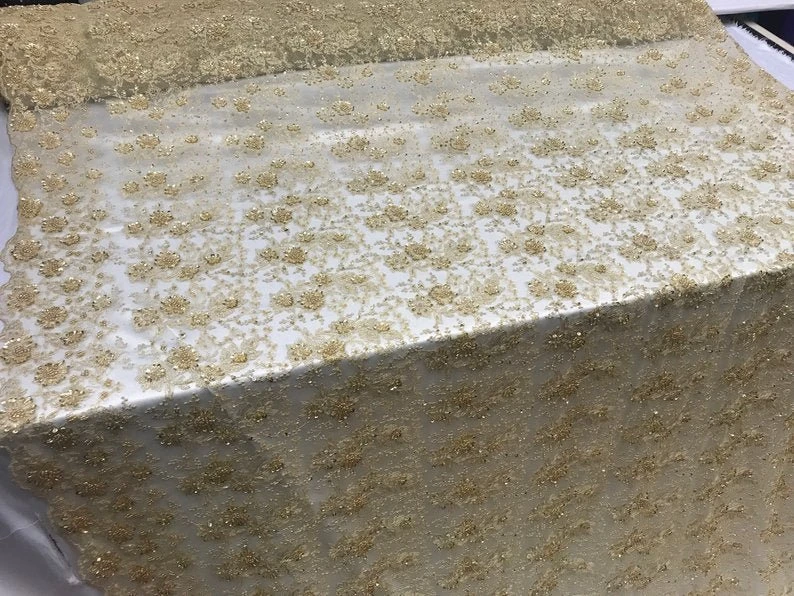 Look unique to others and show your beauty with this Gold embroidery beaded mesh lace that will add the charm to your appearance & make your look eye-catching and beautiful.