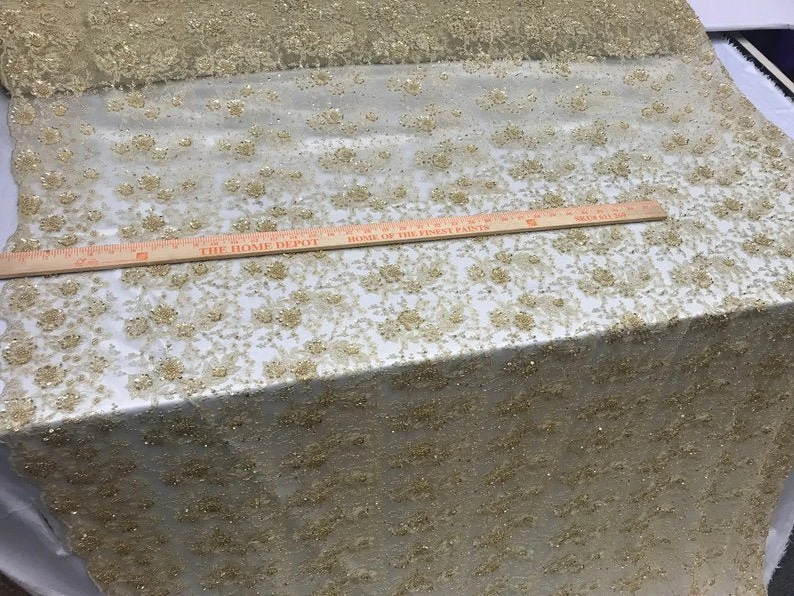 Gold Unique Design Embroidered Beaded Mesh Lace Fabric