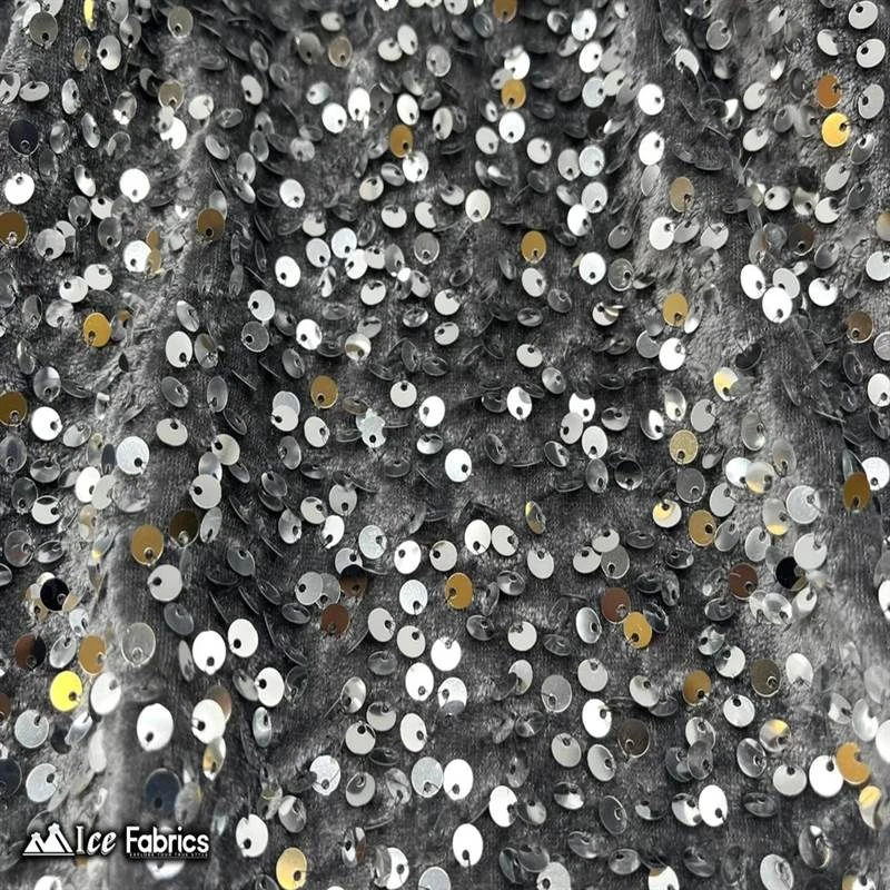 Add a touch of oomph to your look with this Gray Emma Embroidery Sequins on Velvet Fabric. This gorgeous velvet fabric is perfect for wedding, prom, and ballet wear.