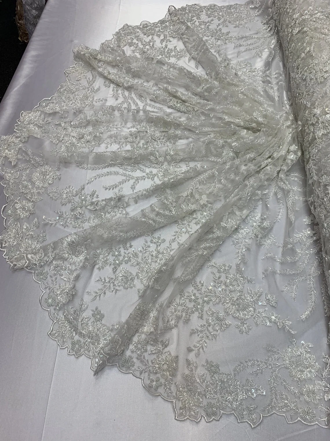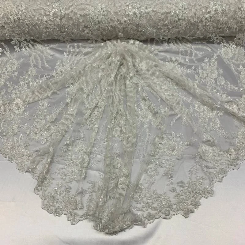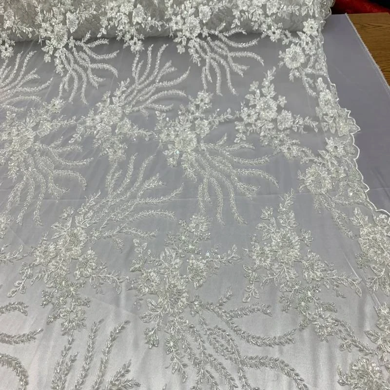 Off-White Handmade Beaded Embroidery Lace Fabric
