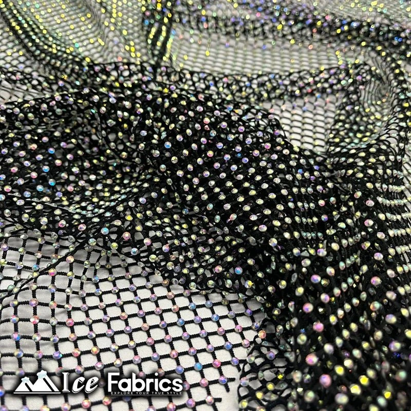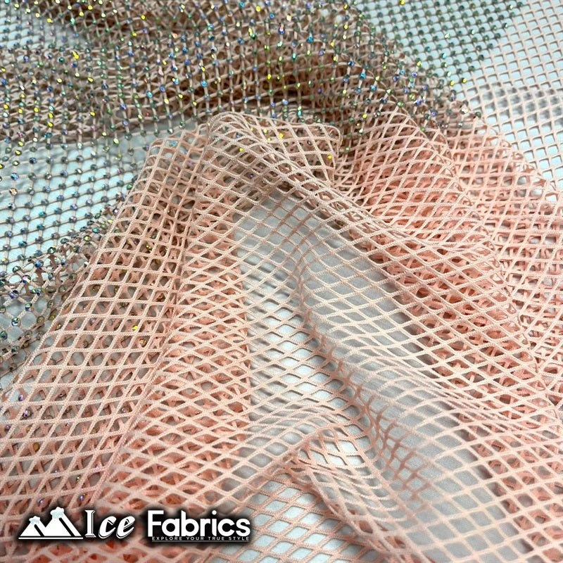 Iridescent Fishnet Crystal Beaded 4 Way Stretch Fabric Fishnet