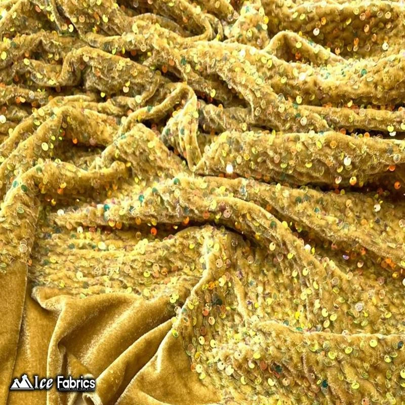 Add a touch of oomph to your look with this Iridescent Gold Emma Embroidery Sequins on Velvet Fabric. This gorgeous velvet fabric is perfect for wedding, prom, and ballet wear.