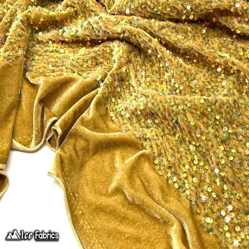 IceFabrics offers “Iridescent Gold Emma Design Sequin Embroidered 2 Way Stretch Velvet Fabric by the Yard” in variant colors and unique size.