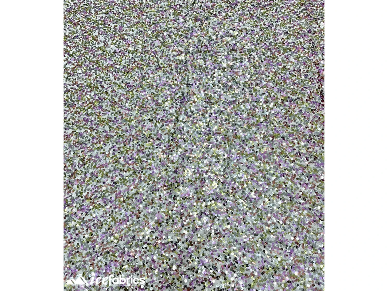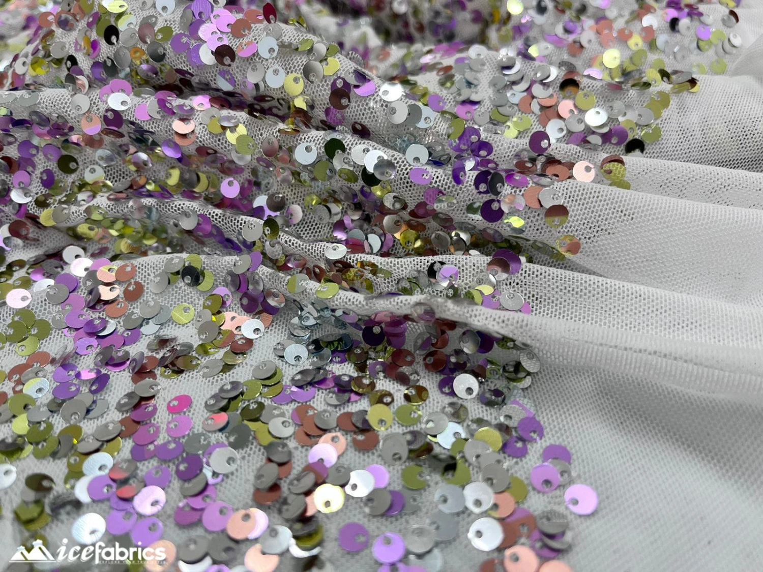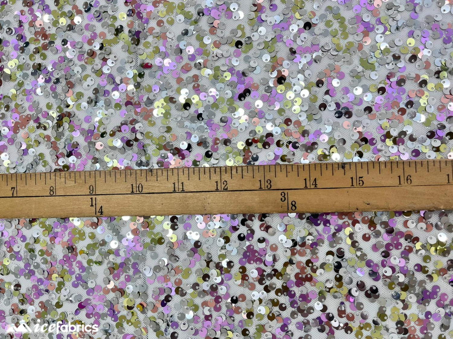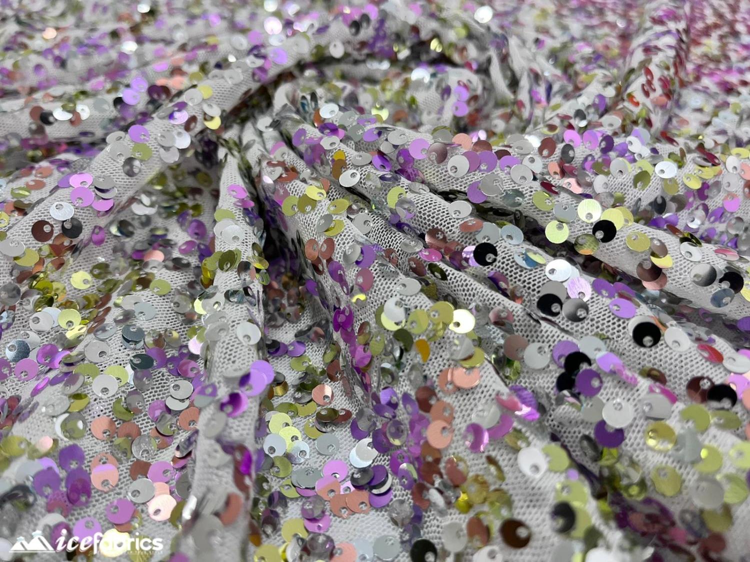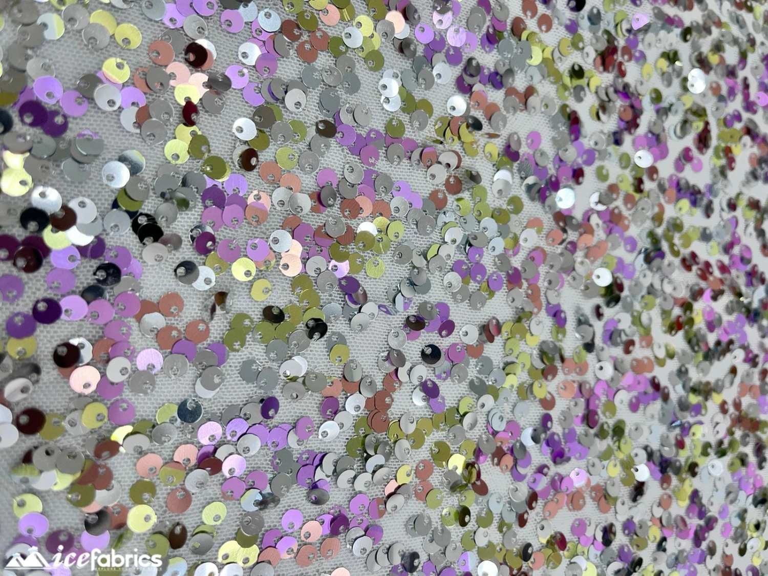 3 Tone 4 Way Mini Stretch Sequins on White Mesh Lace Fabric By The Yard