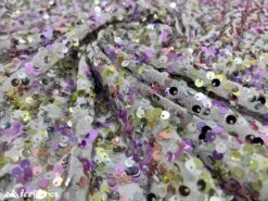 Uses of High-quality 4 Way Iridescent Lavender Green and Silver Sequins Embroidered Mesh Lace Fabric
