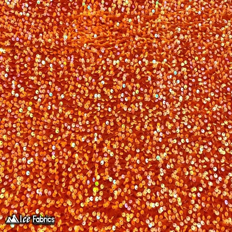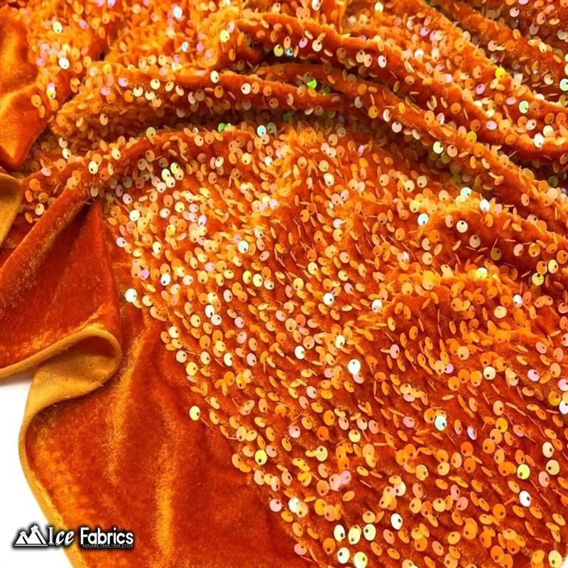 IceFabrics offers “Iridescent Rust Emma Design Sequin Embroidered 2 Way Stretch Velvet Fabric by the Yard” in variant colors and unique size.
