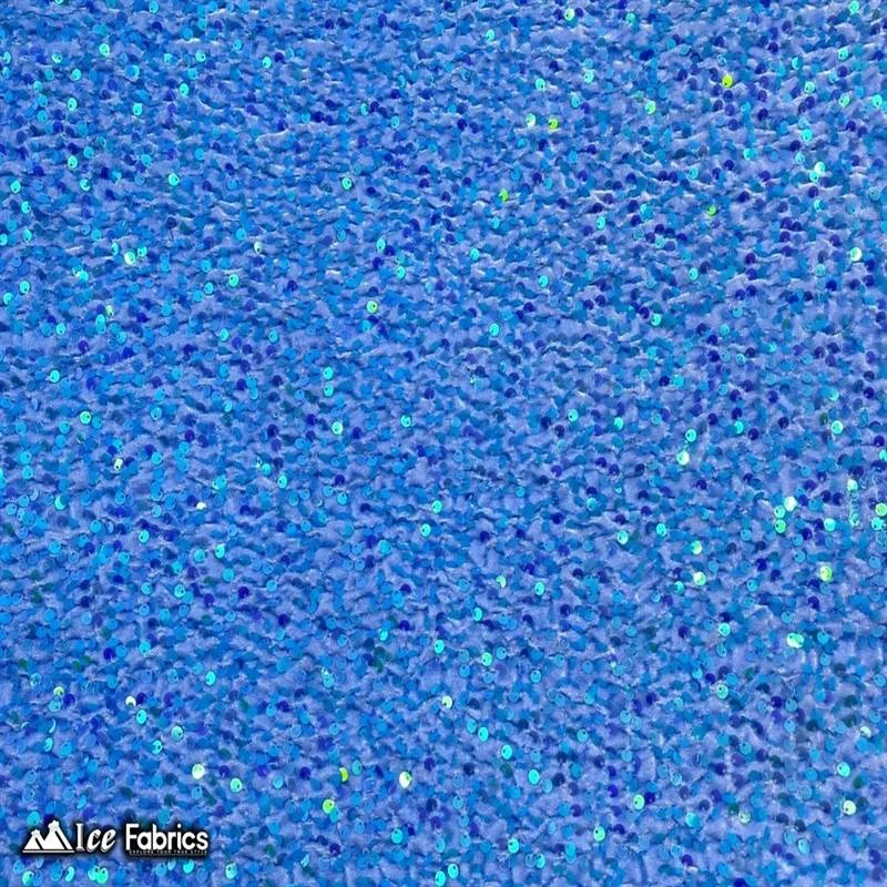 IceFabrics offers “Iridescent Sky Blue Emma Design Sequin Embroidered 2 Way Stretch Velvet Fabric by the Yard” in variant colors and unique size.
