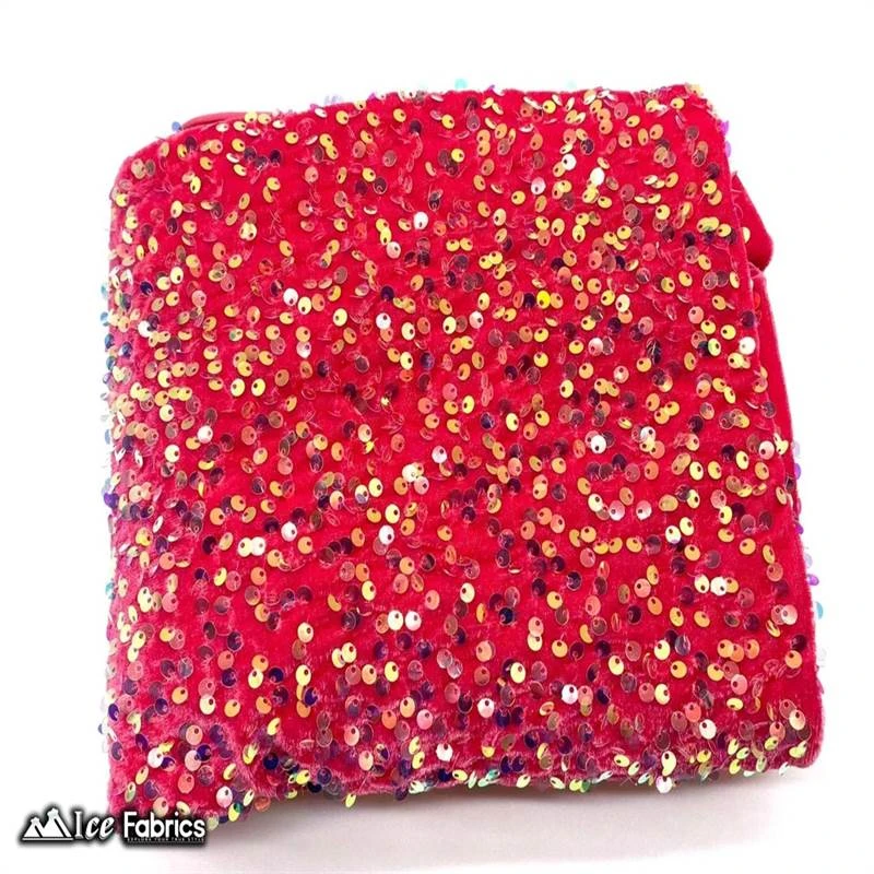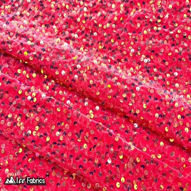 IceFabrics offers “Iridescent Strawberry Pink Emma Design Sequin Embroidered 2 Way Stretch Velvet Fabric by the Yard” in variant colors and unique size.