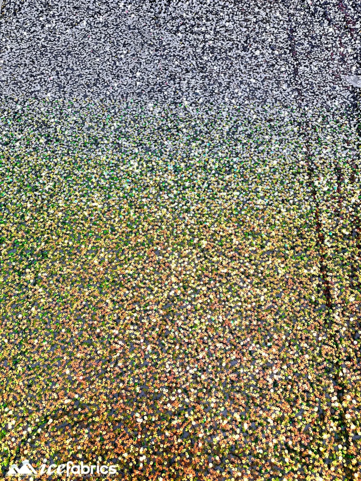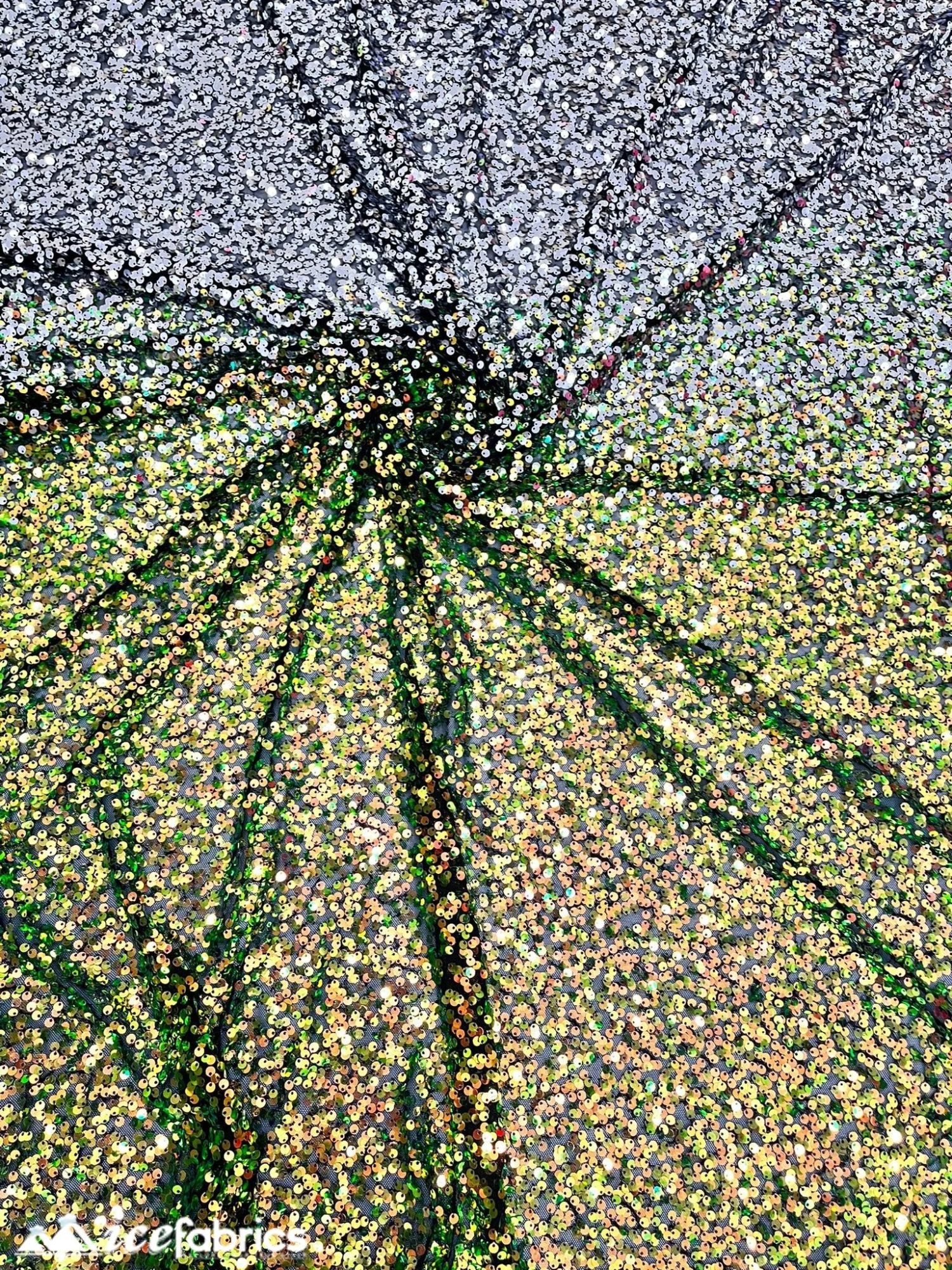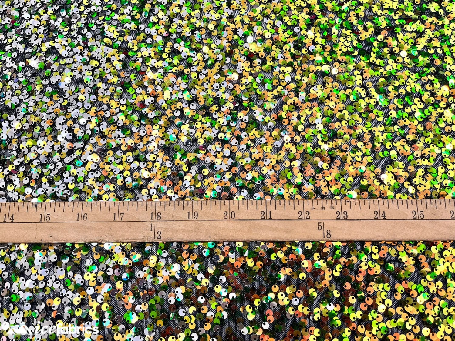 ICE Fabrics offers “Iridescent Yellow Orange and Silver 3 Tone Mini Sequins Mesh Lace Fabric by the yard” in unique sizes and variant colors.