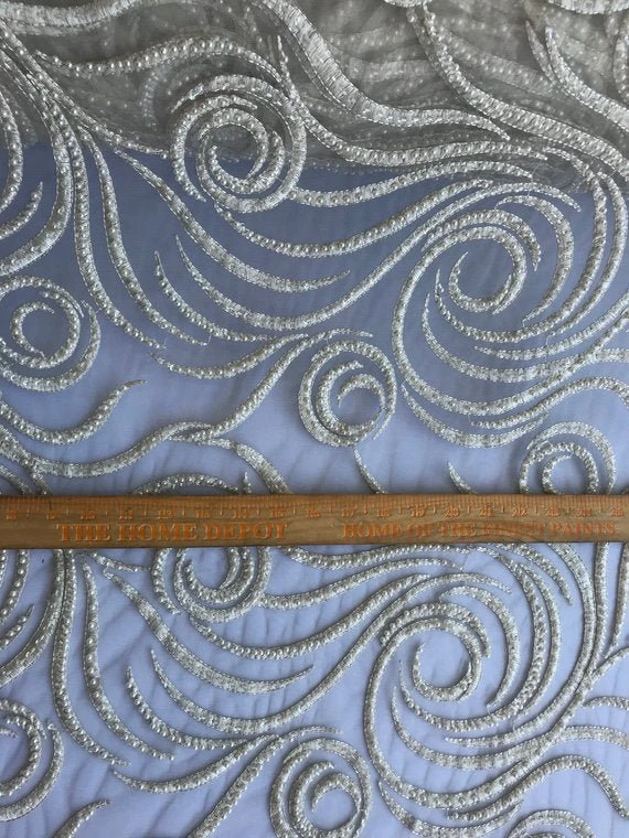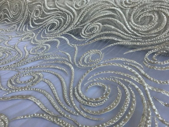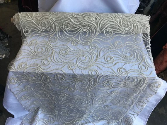 With this beaded floral bridal lace enhance your look by wearing a Lace gown with full-length illusion sleeves, an uncovered back blouse, and nightwear gowns or a flirty midi skirt runners. The lace can be used for divers’ purposes like dresses, jackets, tablecloths, nightgowns, skirts, prom dresses, wedding dresses, and runners for tables, decoration, and much more. It is mostly worn by bridals at wedding events to get appreciation from the guests. Beaded Ivory Floral Bridal Lace Flower Mesh Dress is made of 100% polyester and high-quality stuff.