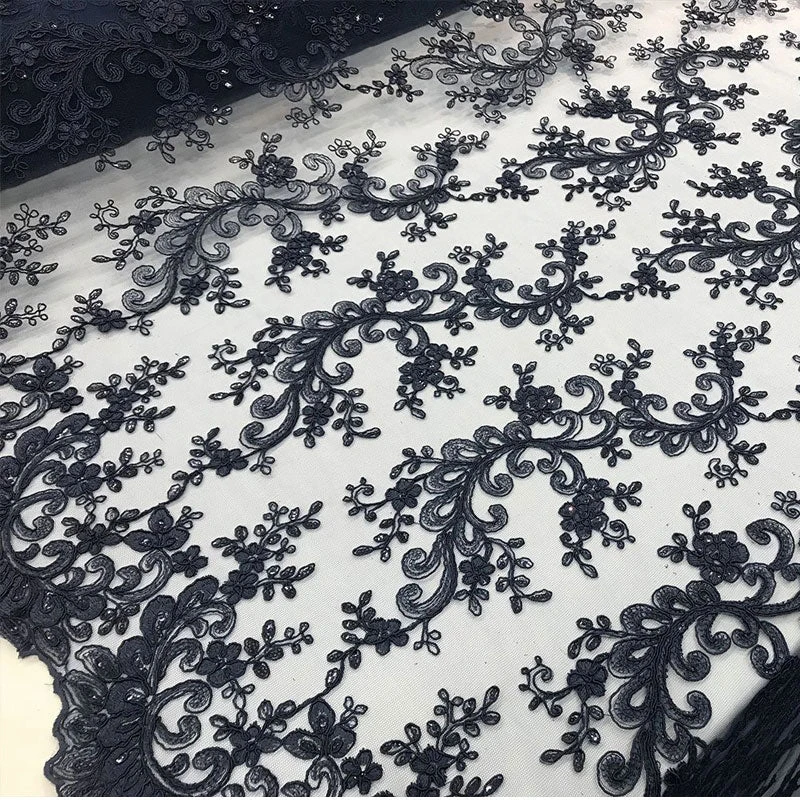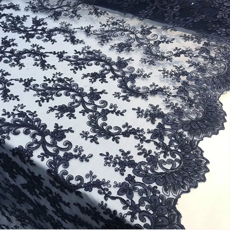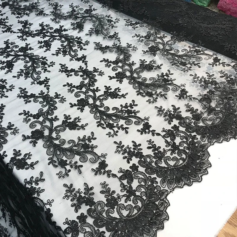 - This Floral Lace Fabric has handsome scallop edges that are uniquely finished on both sides of the fabric.