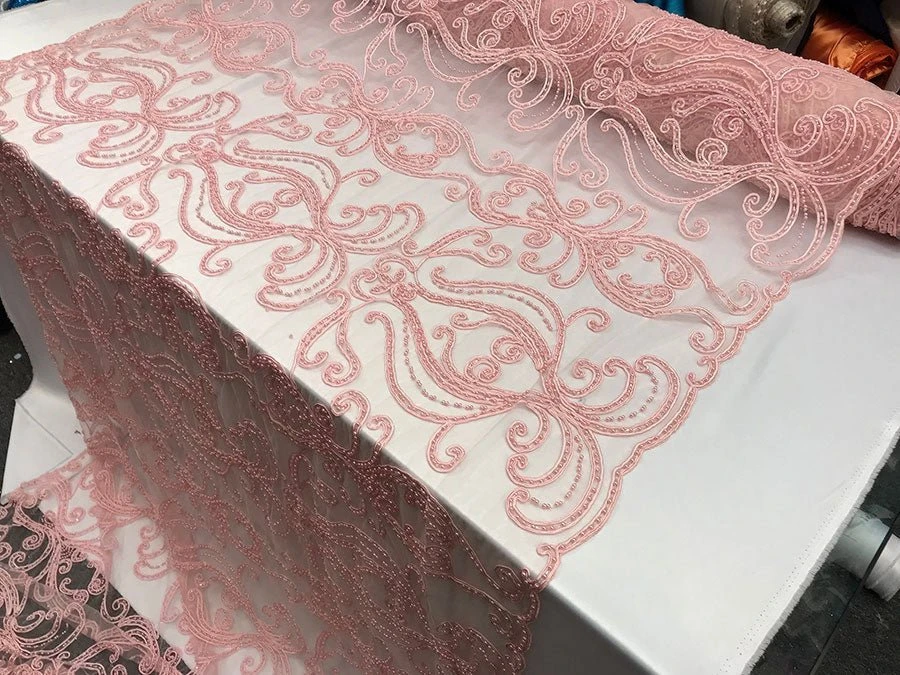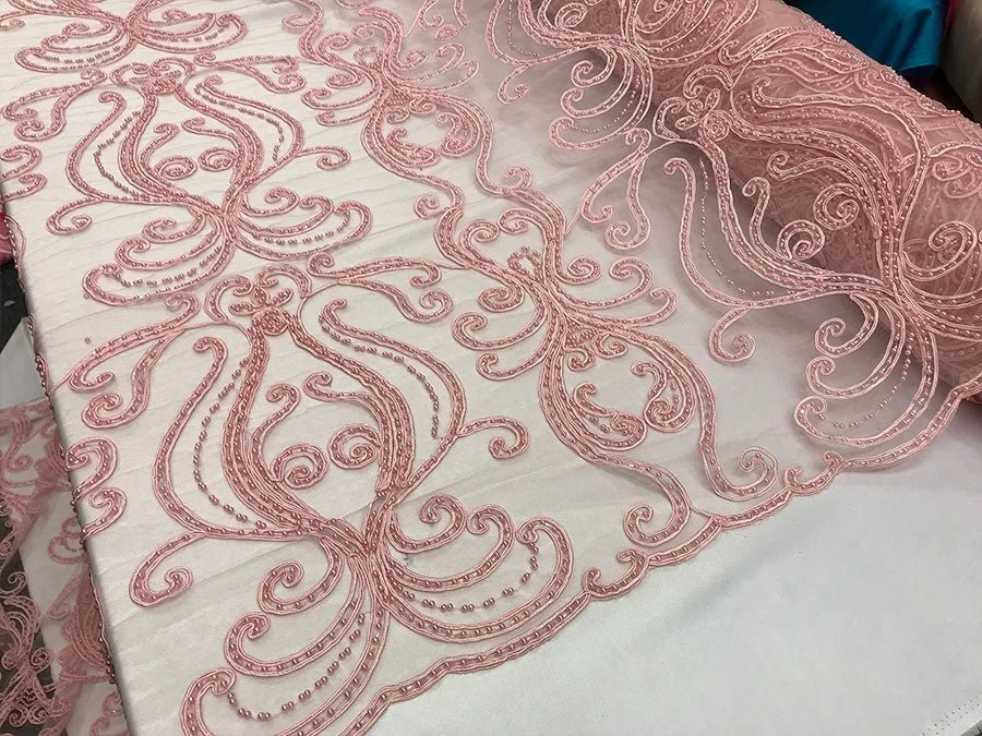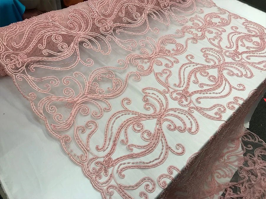 FAQs About “Embroidered Light Pink Beaded Mesh Lace Fabric“