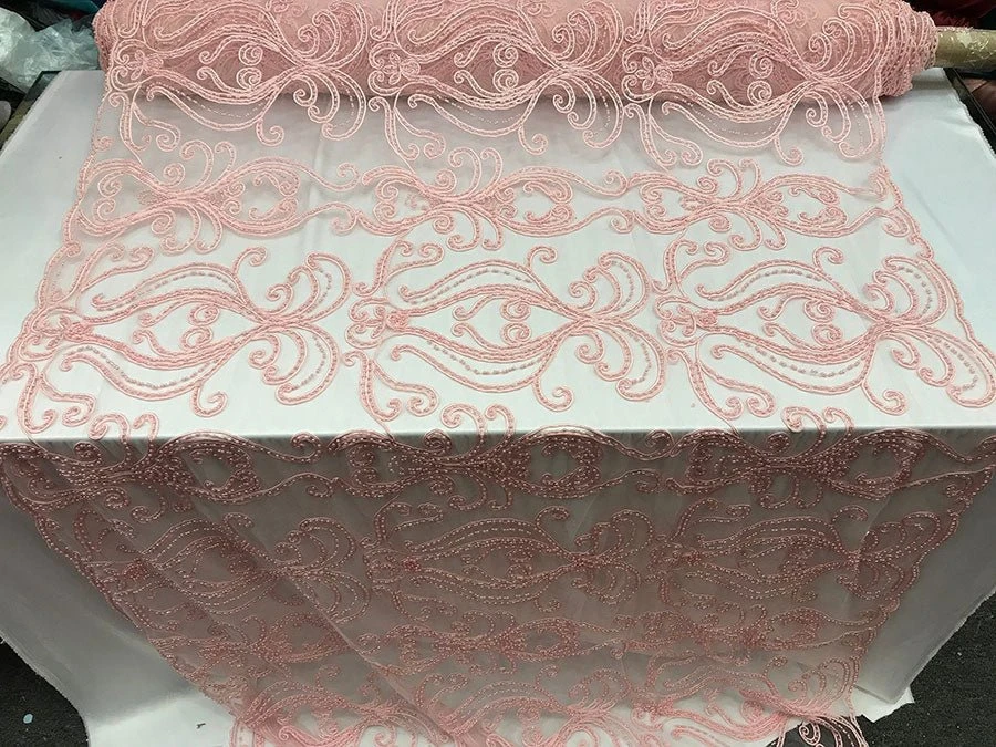 IceFabrics offers “Light Pink Bridal Embroidery Design Beaded Mesh Lace Fabric” in unique size and color.
