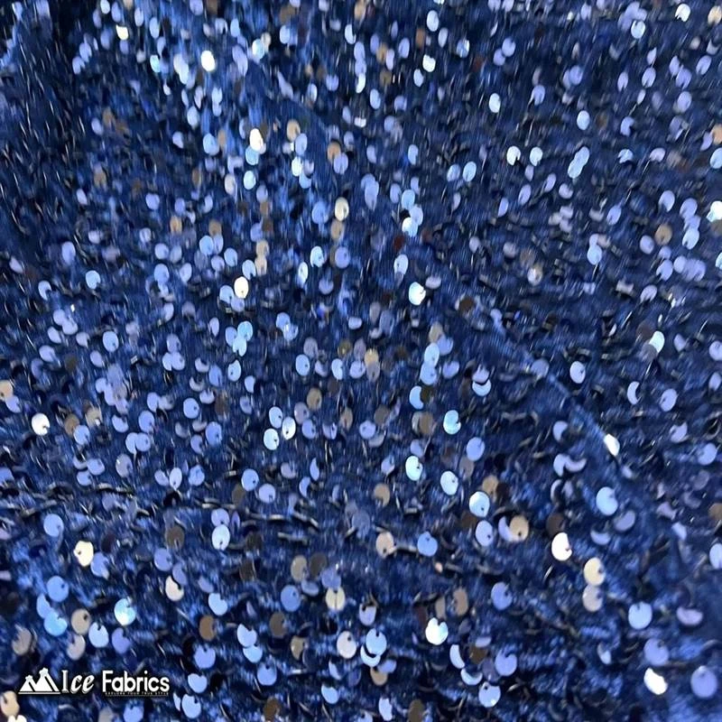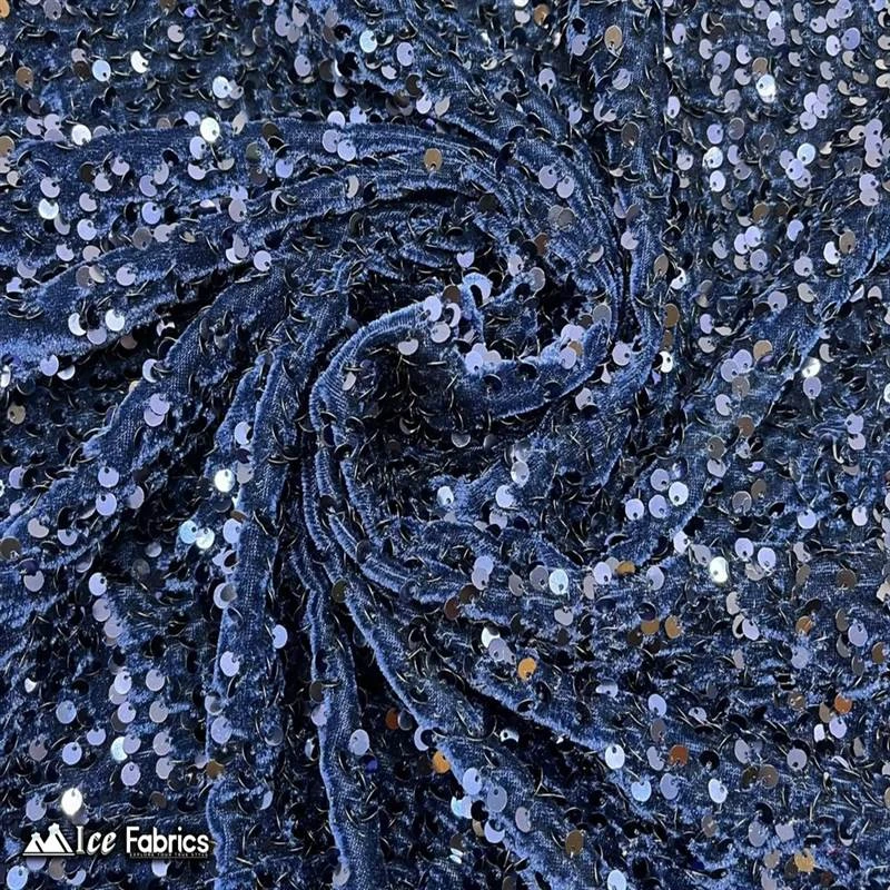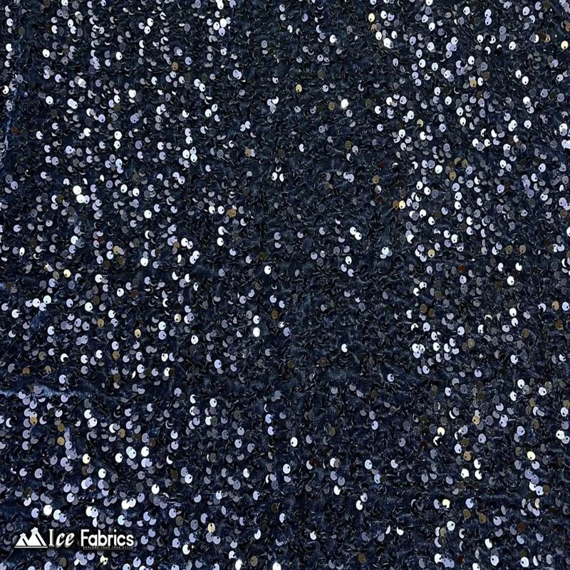 IceFabrics offers “Navy Blue Emma Design Sequin Embroidered 2 Way Stretch Velvet Fabric by the Yard” in variant colors and unique size.