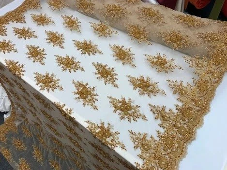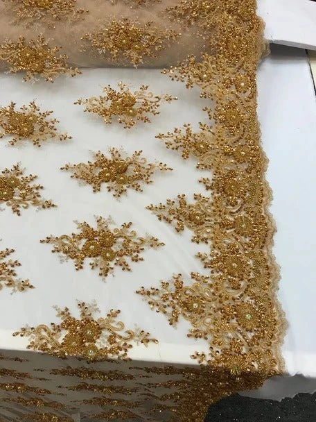New French Embroidered Handmade Beaded Mesh Lace is an attractive and fascinating lace, embellishes with glass beads, and sequins. Its gold color presents a sense of beauty and shines like real gold. Edges and the bottom border of the lace have been carefully decorated with glass and sequins.