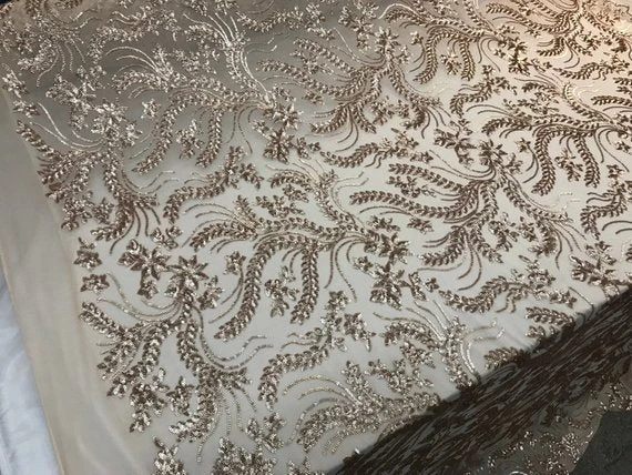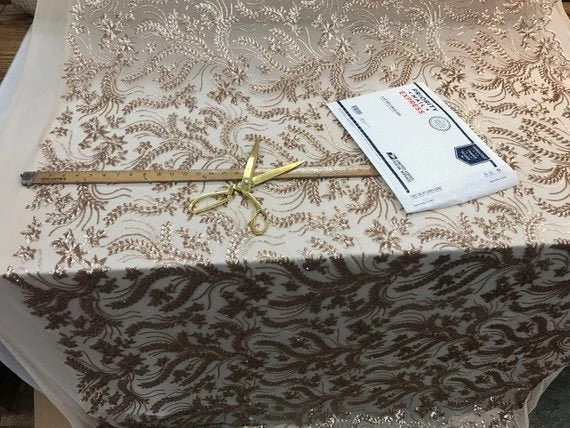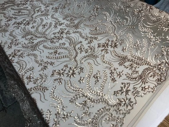 NEW Champagne Design Sequins 4 Way Stretch on a Mesh lace is a beautiful sequins fabric that is adorned with sequins to increase its grace. Embroidery and sequins colors have excellent contrast and matched each other.
