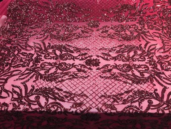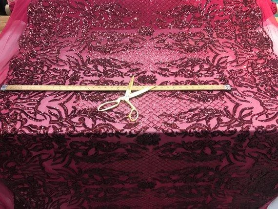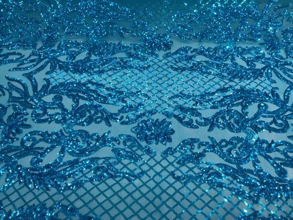 ICE Fabrics offers “New Embroidery Design 4 Way Stretch Sequins on a Mesh Lace Fabric For Decorations Fashion Wedding Prom Dresses” in unique size and variant colors.