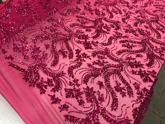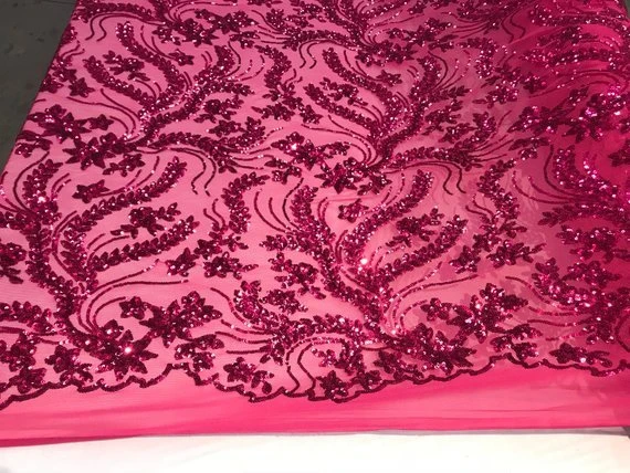 New Fuchsia Embroidery Design 4 Way Stretch Sequin Mesh Lace Fabric