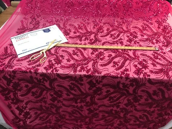 ICE Fabrics offers “New Elegant Design Fuchsia Embroidered 4 Way Stretch Sequin Mesh Lace Fabric Sold by the Yard” in unique size and colors.