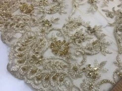 Gold Unique Design Embroidered Beaded Mesh Lace Bridal Veil Fabric