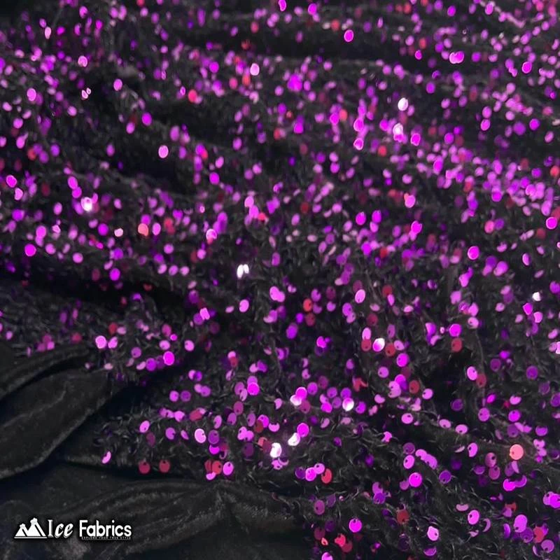 IceFabrics offers “Purple Emma Design Sequin Embroidered 2 Way Stretch Velvet Fabric by the Yard” in variant colors and unique size.