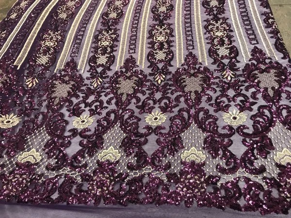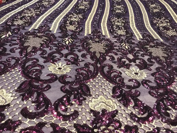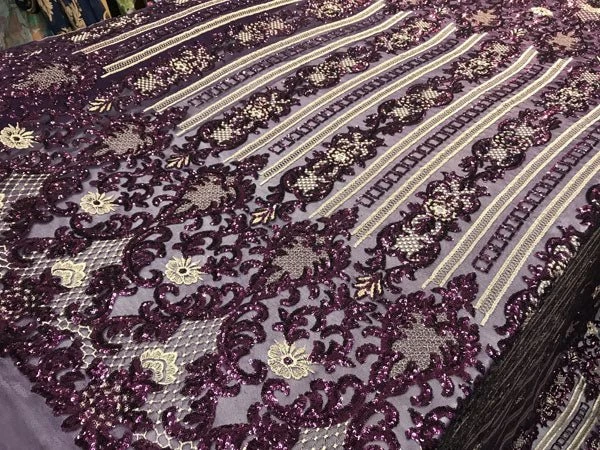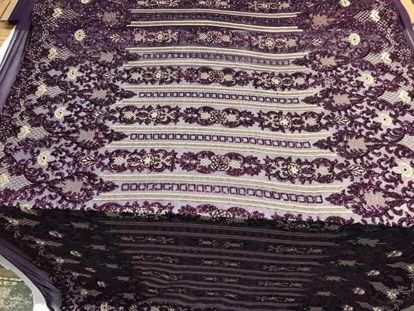 ICE Fabrics offers “New Purple Unique Designed Embroidery 4 Way Stretch Sequin Fabric for Wedding Prom Dresses” in unique size and color.