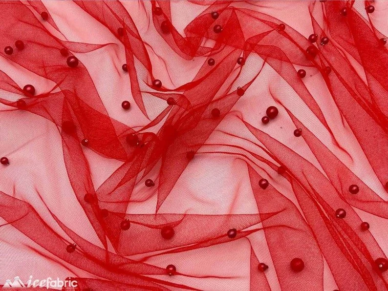 IceFabrics offers Red Pearls Beaded Tulle Lace Fabric in unique size and color.