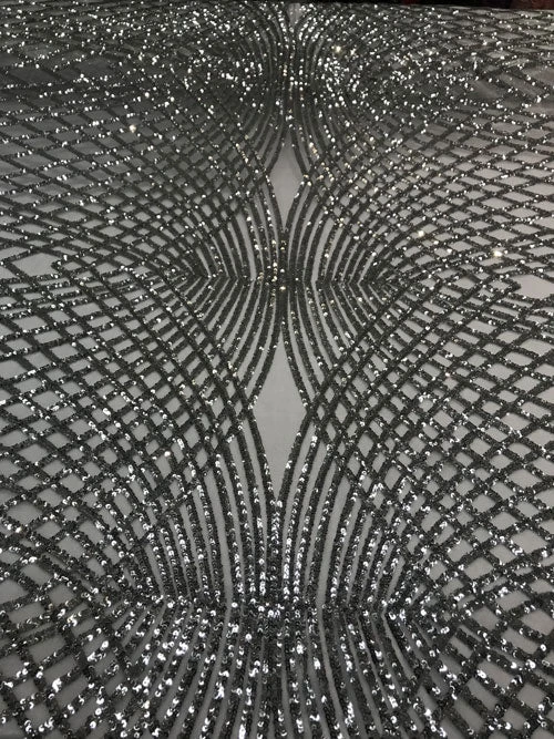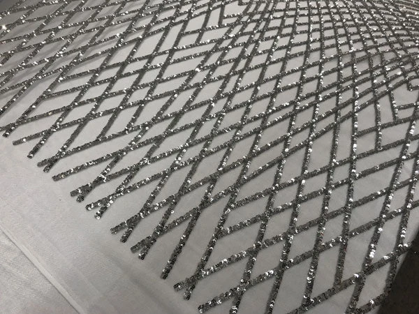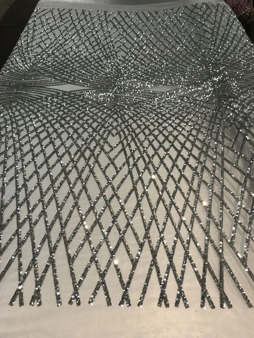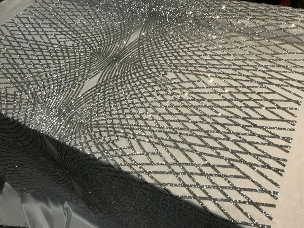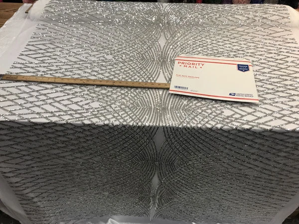 ICE Fabrics offers “Latest Silver Luxury Designed Embroidered 4 Way Stretch Sequin Fabric Sold by the Yard” in unique size and color.