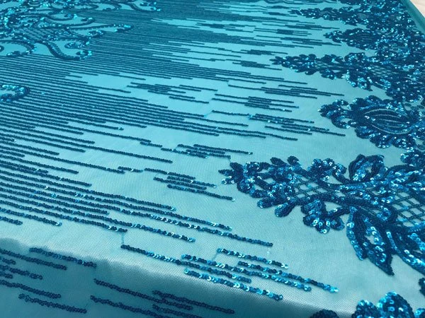 ICE Fabrics offers “New Turquoise Luxury Designed Embroidery 4 Way Stretch Sequin Fabric Sold by the Yard” in unique size and color.