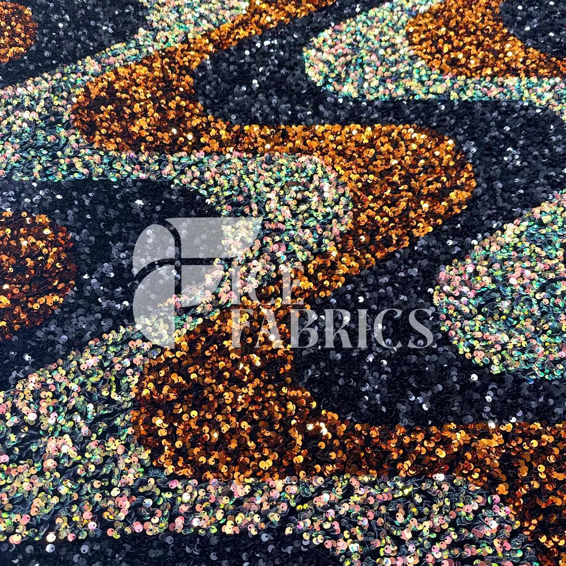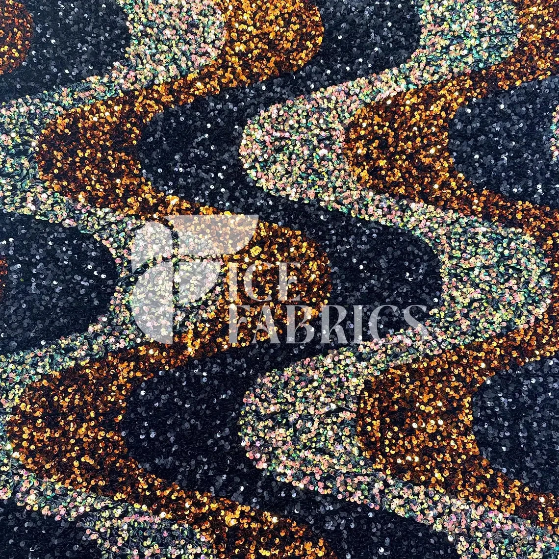Our Wavy Gold Black Iridescent on Black Stretch Velvet Sequin Fabric blends the rich texture of velvet with the dazzling appeal of sequins, creating a fabric that’s both luxurious and attention-grabbing. Featuring a unique wavy pattern of iridescent gold sequins on a deep black velvet base, this velvet sequin fabric adds a bold touch of glamour to any design.