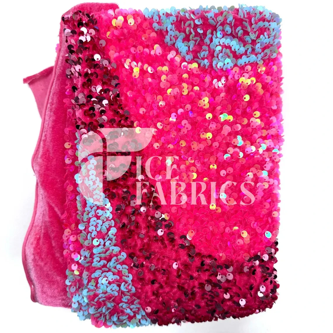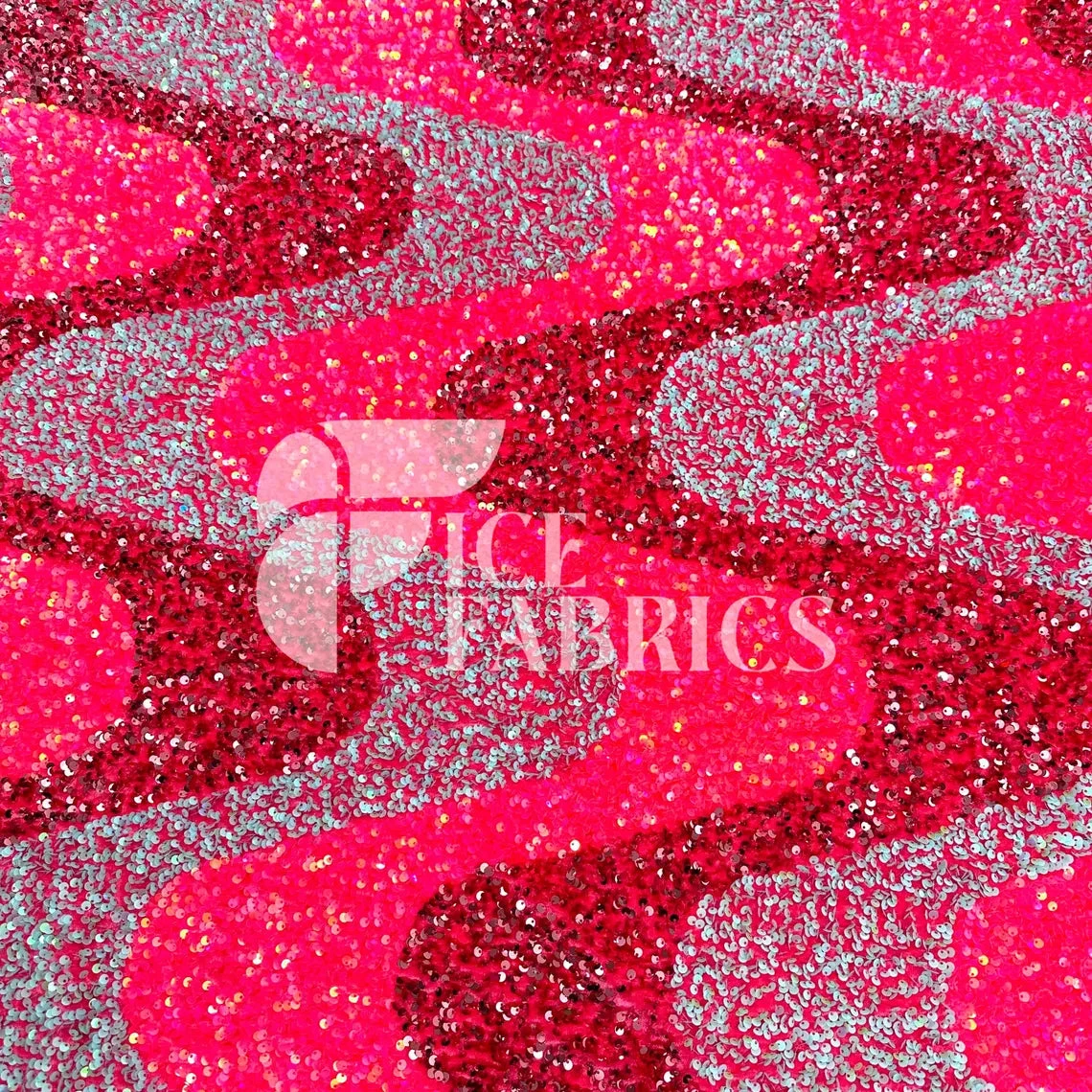 Our Wavy Neon Pink Blue Iridescent on Pink Stretch Velvet Sequin Fabric blends the plush texture of velvet with the dazzling allure of sequins. This velvet sequin fabric features a captivating wavy pattern of neon pink and blue iridescent sequins on a soft pink velvet base, delivering both luxury and brilliance.