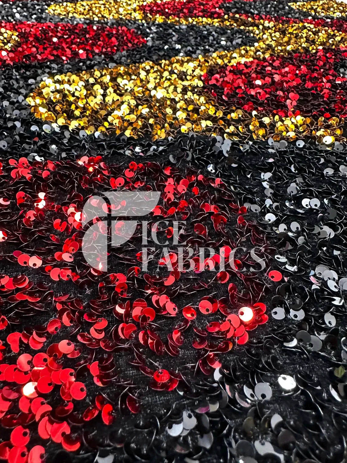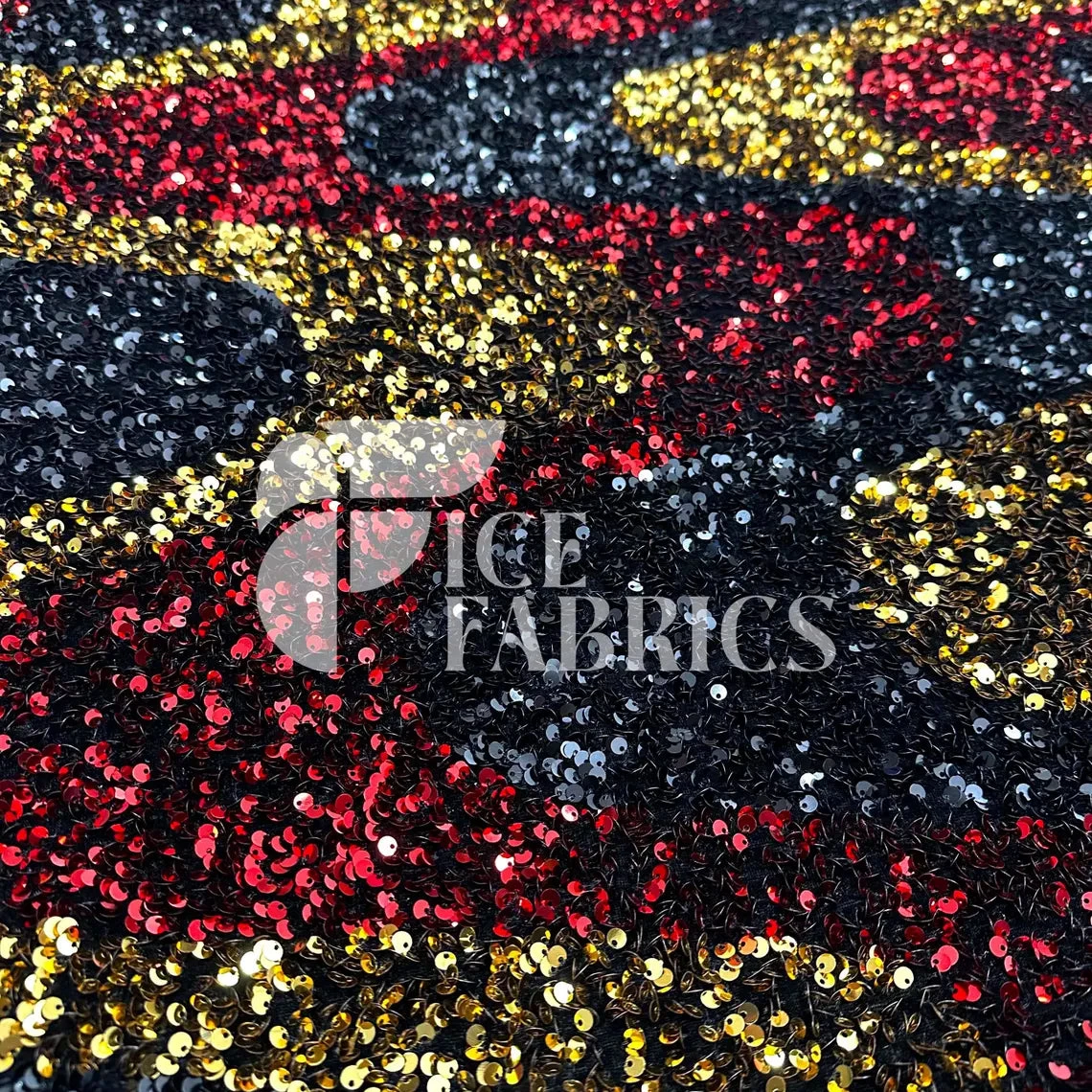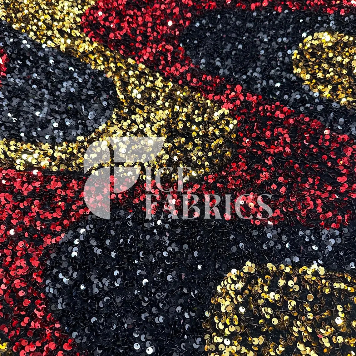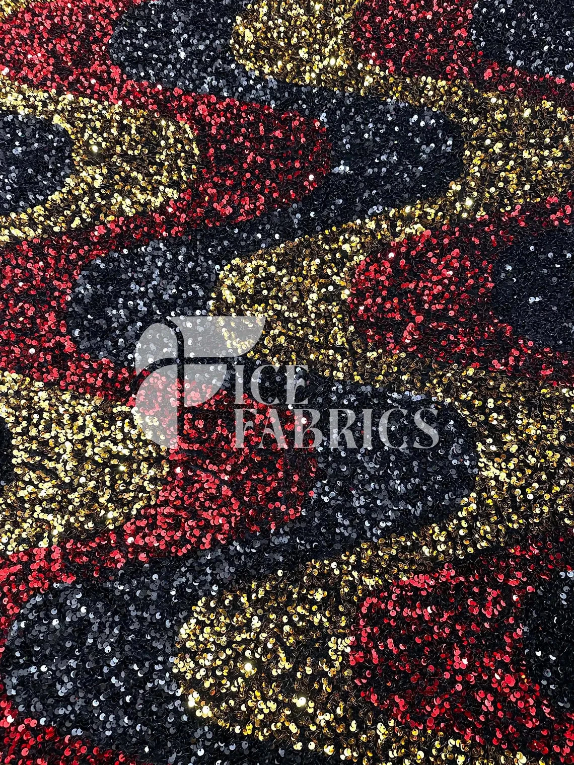Our wavy red, black, and gold on black stretch velvet sequin fabric perfectly blends the sumptuous texture of velvet with the stunning allure of sequins. This luxurious velvet sequin fabric features a unique wavy pattern adorned with vibrant red, black, and gold sequins on a rich black velvet base, making it an eye-catching choice for any design.