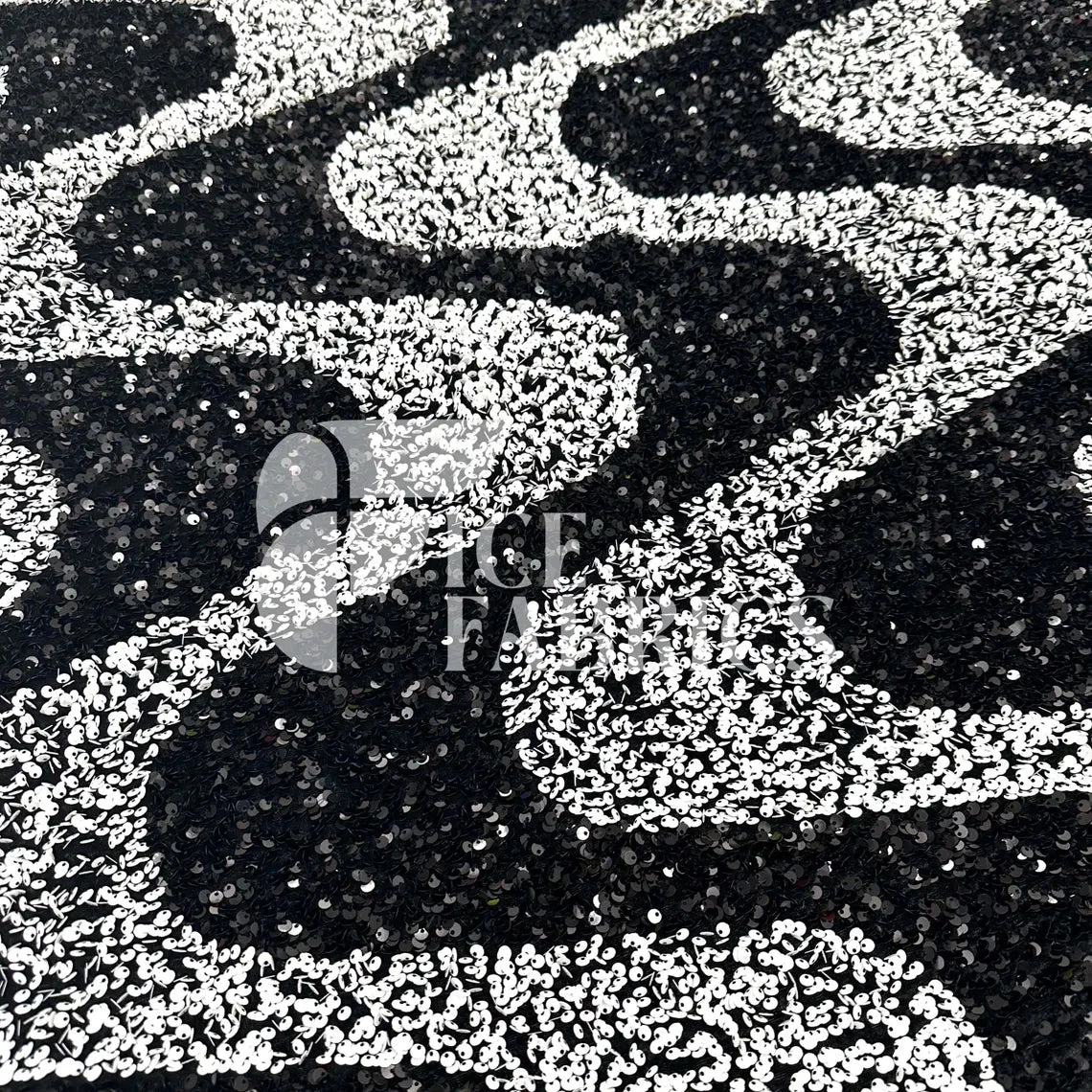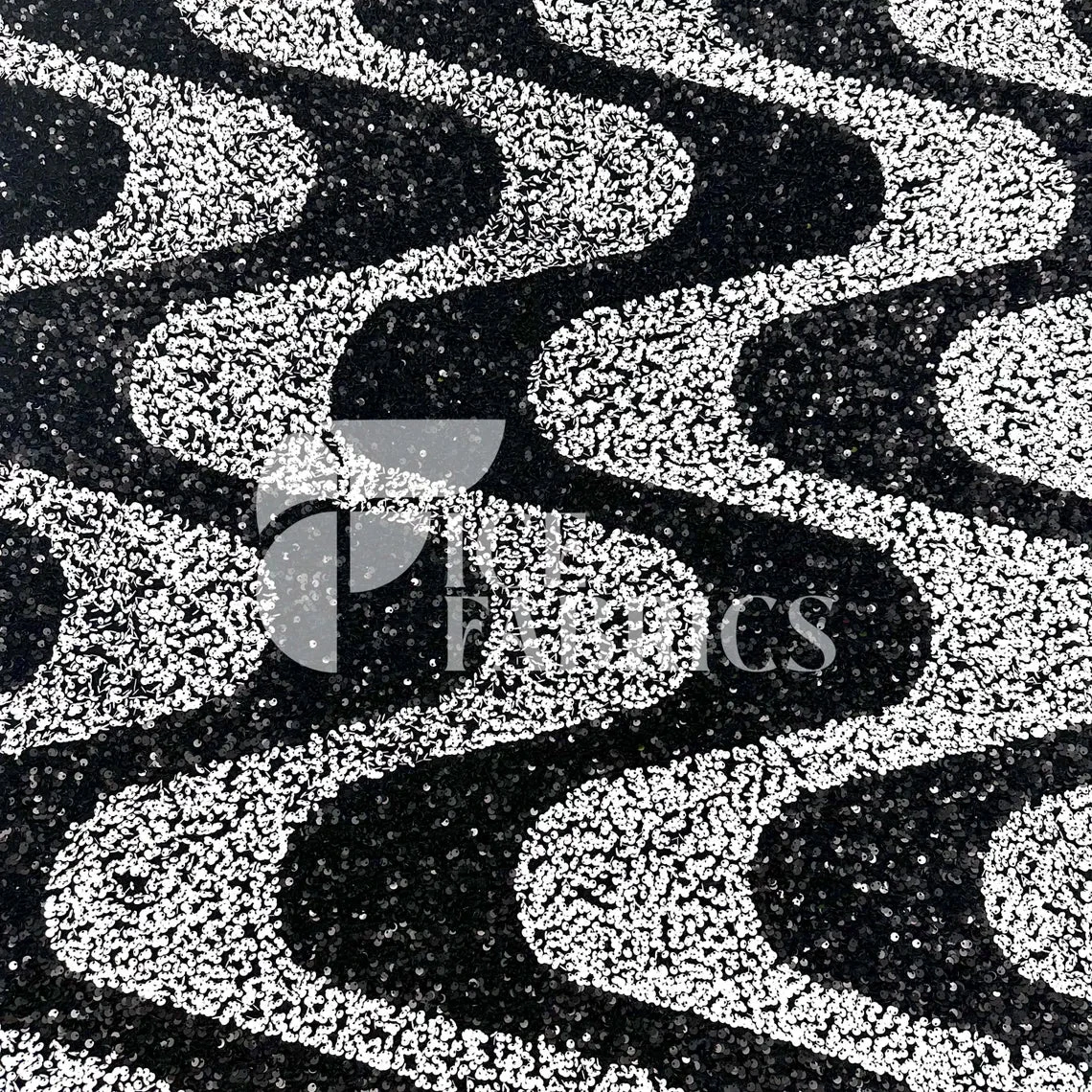 Introducing our Wavy White Black on Black Stretch Velvet Sequin Fabric, a striking combination of luxurious velvet and eye-catching sequins. This exquisite velvet sequin fabric features a unique wavy pattern, showcasing contrasting white and black sequins against a rich black velvet base.