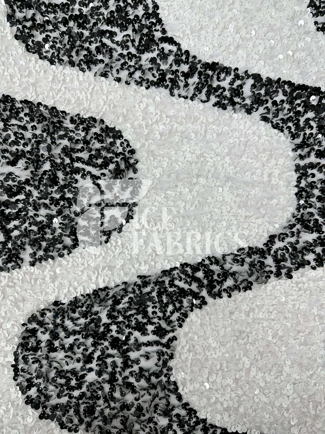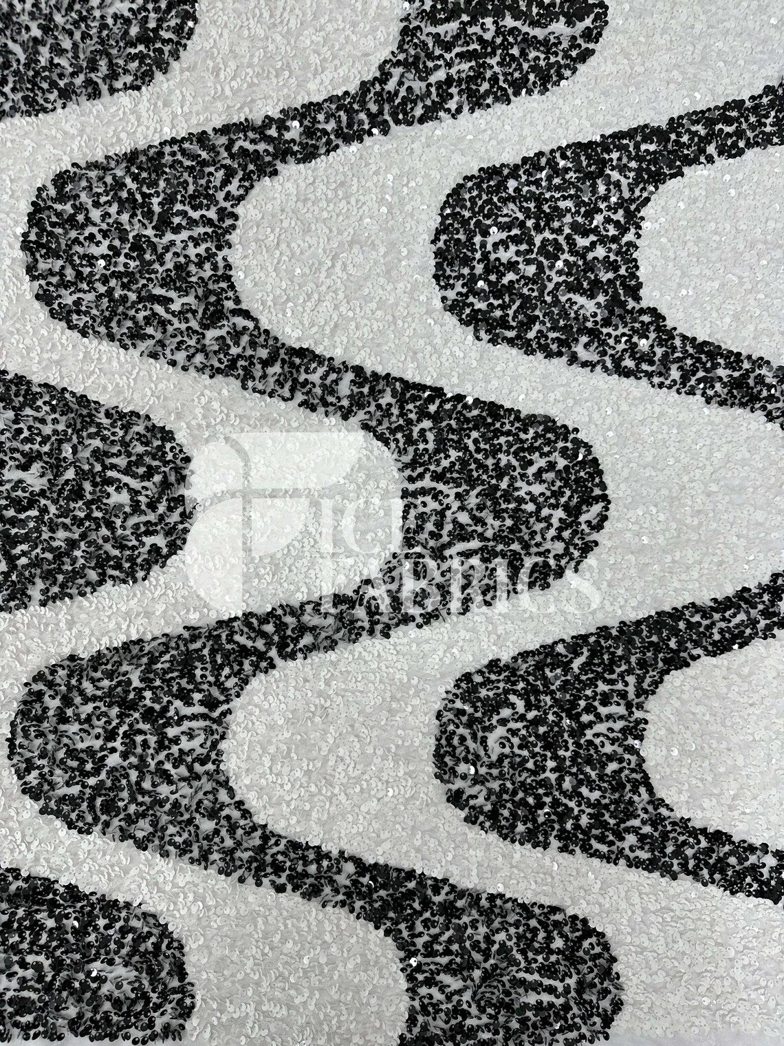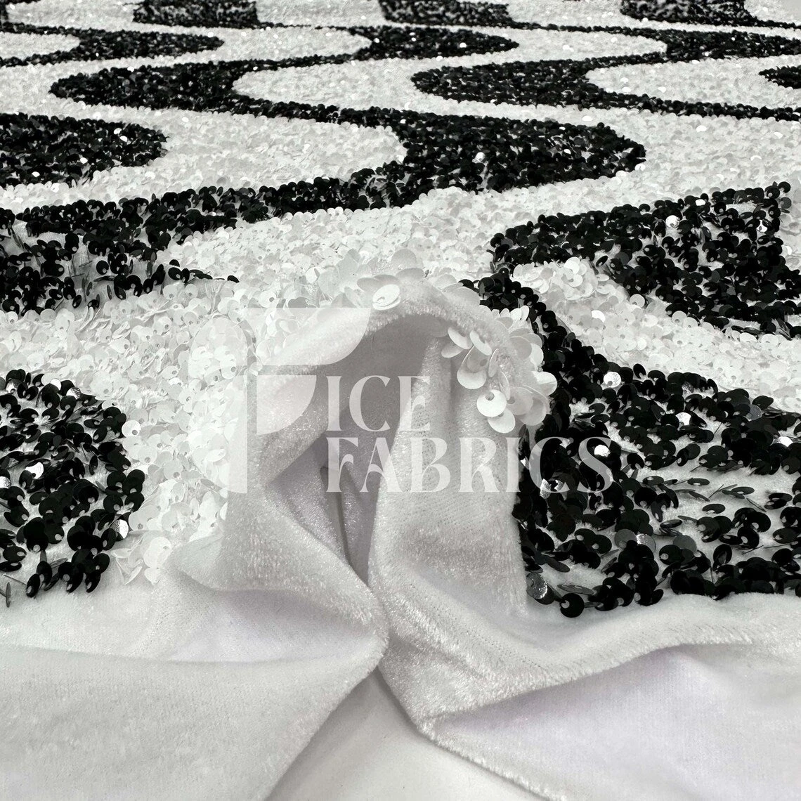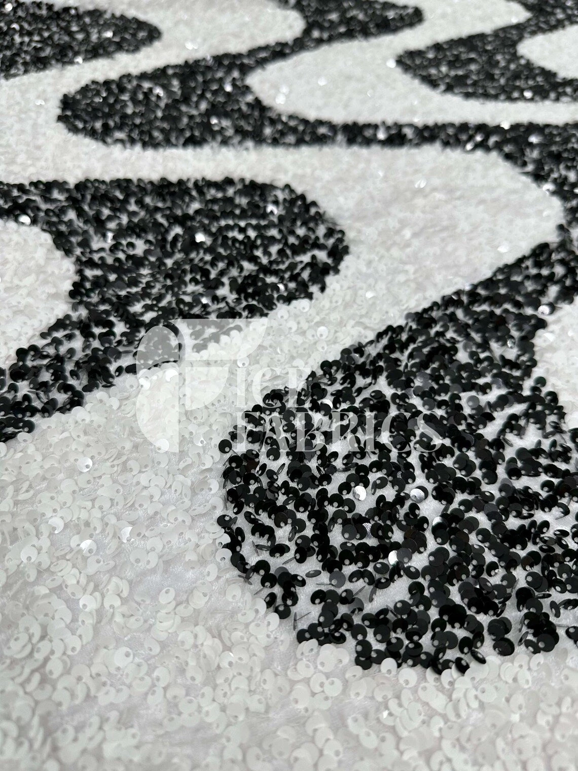 Introducing our Wavy White and Black on White Stretch Velvet Sequin Fabric, a stunning blend of luxurious velvet and shimmering sequins. This velvet sequin fabric features a unique wavy pattern created by iridescent white and black sequins on a pristine white velvet base. The result is a fabric that offers both elegance and a touch of glamour, perfect for various creative projects.